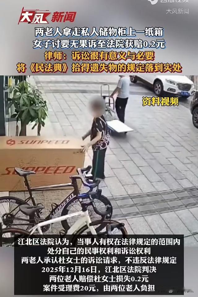 小题大做?重庆,两位老人将女子放在车位后面储物柜上的纸箱拿走,女子多次和二人沟通,二人拒绝返还,女子一怒之下起诉二人,要求他们返还纸箱或者赔偿0.2元。 据大风新闻等报道,杜女士在江北区某小区居住,并在小区里买了一个私家车位。 杜女士的车位比较大,于是她在车位后面安装了一个储物箱,用来存放杂物。 2025年9月24日,杜女士将一个装有鞋子的纸箱临时放在储物柜上,可过了一会过去拿时,刚刚还在的箱子竟然不见了。 杜女士赶紧查看监控,监控显示,两个老人踮着脚,费力地将纸箱从柜子拿取下来,然后拖着纸箱离开了。 这两个老人,一个是是黄某某,一个是向某某,他们二人一个69岁,一人79岁。 杜女士非常气愤,自己放在私家车位、私人储物柜上的东西,二人有什么权利拿? 杜女士找到两位老人,要求他们返还纸箱。 两位老人最开始还和颜悦色的诉苦,说他们年纪大了挣不到钱,讨人嫌,又说杜女士车位是敞开的,以为纸箱是没人要的。 二人理由找了一大堆,目的只有一个:纸箱不退! 杜女士认为,这两位老人就是仗着年纪大故意耍无赖,这是一种不正之风,必须要刹一刹这种风气! 于是杜女士也和他们杠上了,非让二人返还纸箱,两位老人只有一句话:我们凭本事捡的,凭什么还?年轻人小题大做! 二人以为杜女士耗不起,这件事就这么过去了,可让他们没想到的是,杜女士直接将他们起诉了。 黄某某和向某某傻眼了,为了一个2毛钱的纸箱,至于吗? 至于!9月29日,本案正式立案,因适用限额诉讼简易程序,不久以后进行了公开审理。 庭审时,杜女士诉求只有两个,一是黄某某和向某某返还她的纸箱,如果无法返还,就赔偿她2毛钱。二是诉讼费由两名被告承担。 黄某某和向某某当庭承认,他们拿了杜女士的纸箱,但是纸箱已经被他们卖了,他们愿意赔偿杜女士2毛钱。 最终,黄某某和向某某被判赔偿杜女士0.2元,20元案件受理费由黄某某和向某某承担。 本案一经报道,大家众说纷纭。有人说,杜女士小题大做,两个老人能有什么坏心思?拿就拿了吧,何必为难他们?为了2毛钱打官司,这不是浪费司法资源吗? 也有人说,这不是多少钱的问题,不管是2毛,还是2万,没经过别人同意拿别人的东西,这就是偷! 杜女士为了2毛钱的纸箱起诉两位老人,看似是小题大做,但深入分析,这一行为不仅合理合法,更具有深远的社会意义! 《民法典》第三百一十四条规定,拾得遗失物,应当返还权利人。拾得人应当及时通知权利人领取,或者送交公安等有关部门。 杜女士将装有鞋子的纸箱放在自己私家车位后的储物柜上,该物品并非遗失物,两位老人未经允许将其拿走,属于无权占有。 杜女士多次要求返还,老人拒绝,这种行为构成了对杜女士财产权的侵犯。 杜女士通过诉讼维护自己的合法权益,是在行使法律赋予的权利,并非小题大做。 至于是否浪费司法资源的问题,不能简单地以诉讼标的额的大小来评判。 司法资源的设立目的是为了保障公民的合法权益,维护社会的公平正义。 每一个案件,无论标的大小,都关系到当事人的合法权益和法治秩序。 如果因为案件标的小,就拒绝受理或认为是浪费资源,那么会传递出一种错误的信号,即法律只保护大案要案,小的权益可以随意被侵犯。 这会导致捡到东西拒不归还、随意侵占他人财物的现象愈发普遍,最终破坏整个社会的法治环境。 法律并非仅服务于大案要案,更应体现在日常细微之事中。 杜女士的诉讼行为实际上是在维护法律的尊严和权威,促使人们尊重他人的财产权,从长远来看,有利于减少类似侵权行为的发生,节约司法资源。 本案的意义不仅在于维护杜女士个人的合法权益,更在于其社会示范效应。 这一判决传递了一个明确的信息:法律是公正的,不会因为当事人的年龄、身份或案件标的的大小而有所偏袒,无论涉案数额多寡,任何人的合法权益均应受到保护。 最后,杜女士为了2毛钱打官司,您认为到底值不值得?