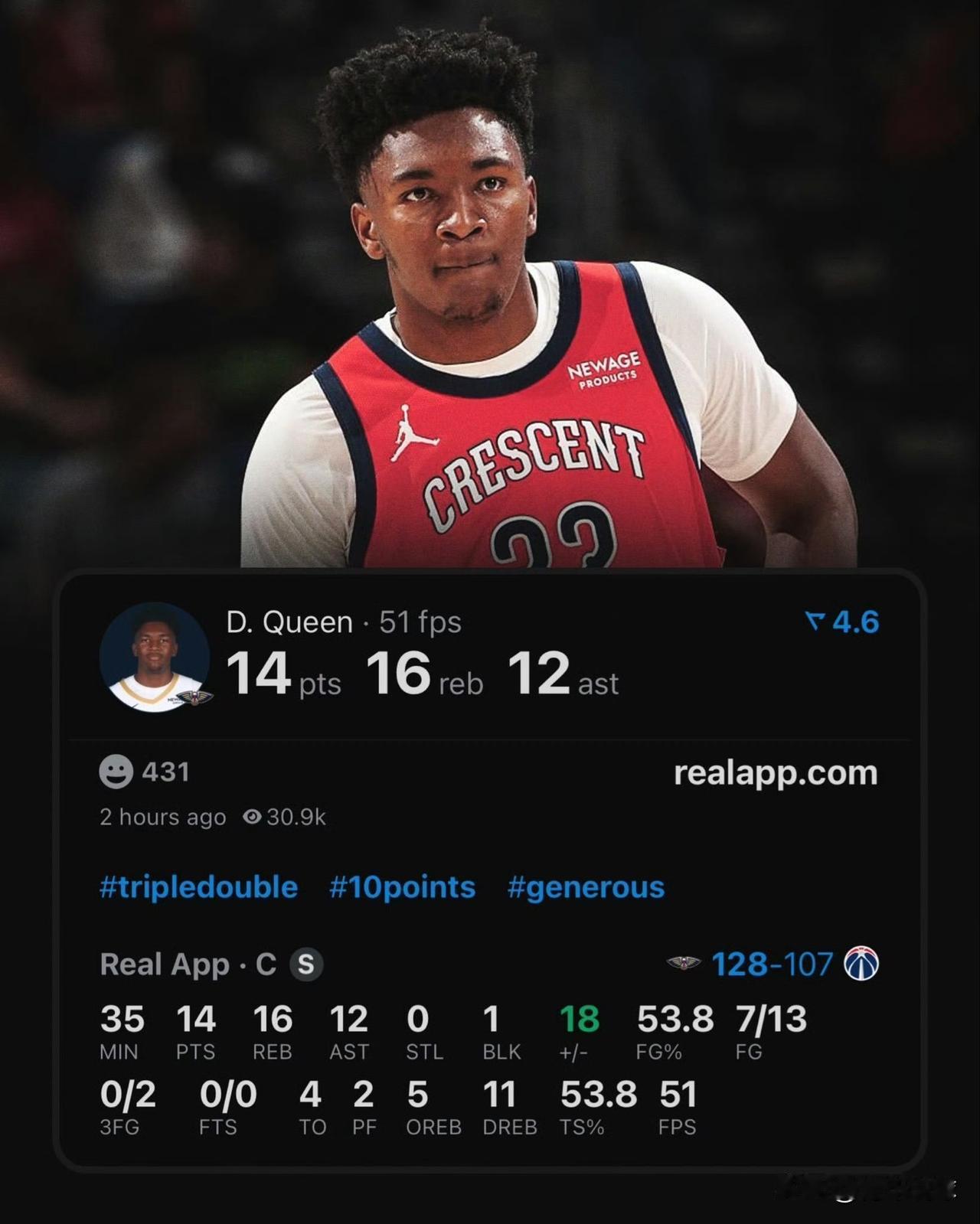 非卖品!鹈鹕队有自己的“约基奇”! 今天,鹈鹕队以128-107大胜奇才队,新秀奎因表现出色,他全场得到14分16篮板12助攻的三双数据,正负值为+18。 值得一提的是,本赛季至今2025年的新秀只拿下过2次三双的数据,都是出自奎因之手,强如弗拉格、埃奇库姆没有做到过,他与后面两个人走的是不一样的路线。难怪都说奎因才是鹈鹕队真正的非卖品,作为一个中锋球员,他愿意干脏活累活,还有着不错的组织能力,这已经是十分难得的事情。当然,篮下基本功和外线投篮能力有所欠缺,只要补齐这些短板,鹈鹕队将迎来属于自己的“约基奇”!