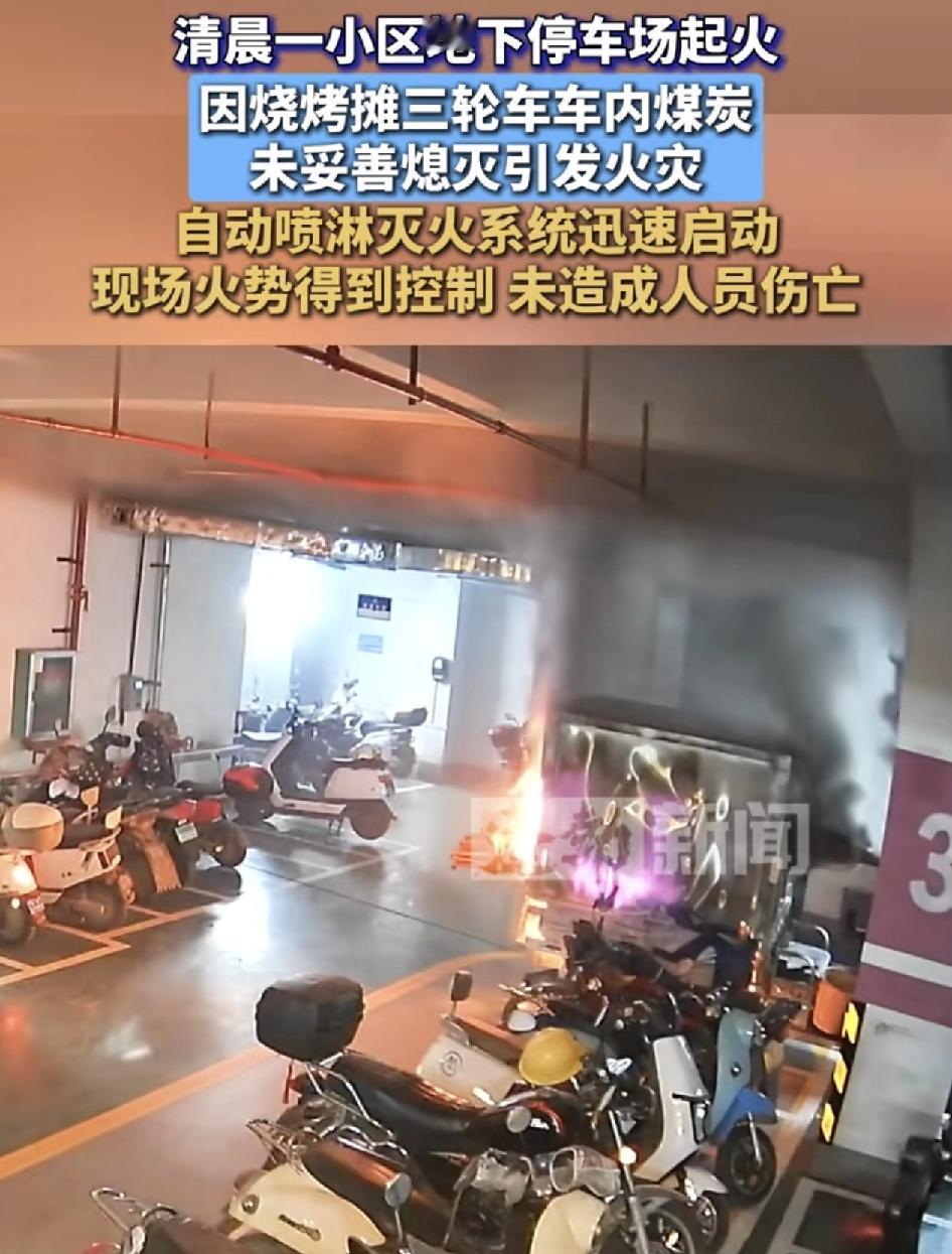 广西钦州一地下停车场清晨突然着火,起因是由于一辆烤肠摊的三轮车内炭火未及时熄灭,导致的。幸亏是停车场的喷淋系统及时启动,没有造成更大的财产,人员受伤。网友们说,终于看到一家单位把消防系统做得如此完善的了,消防安全一刻不能忽视。但也从这一起事故中看到了人为导致的火灾。