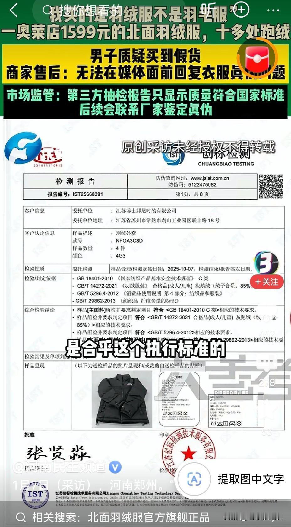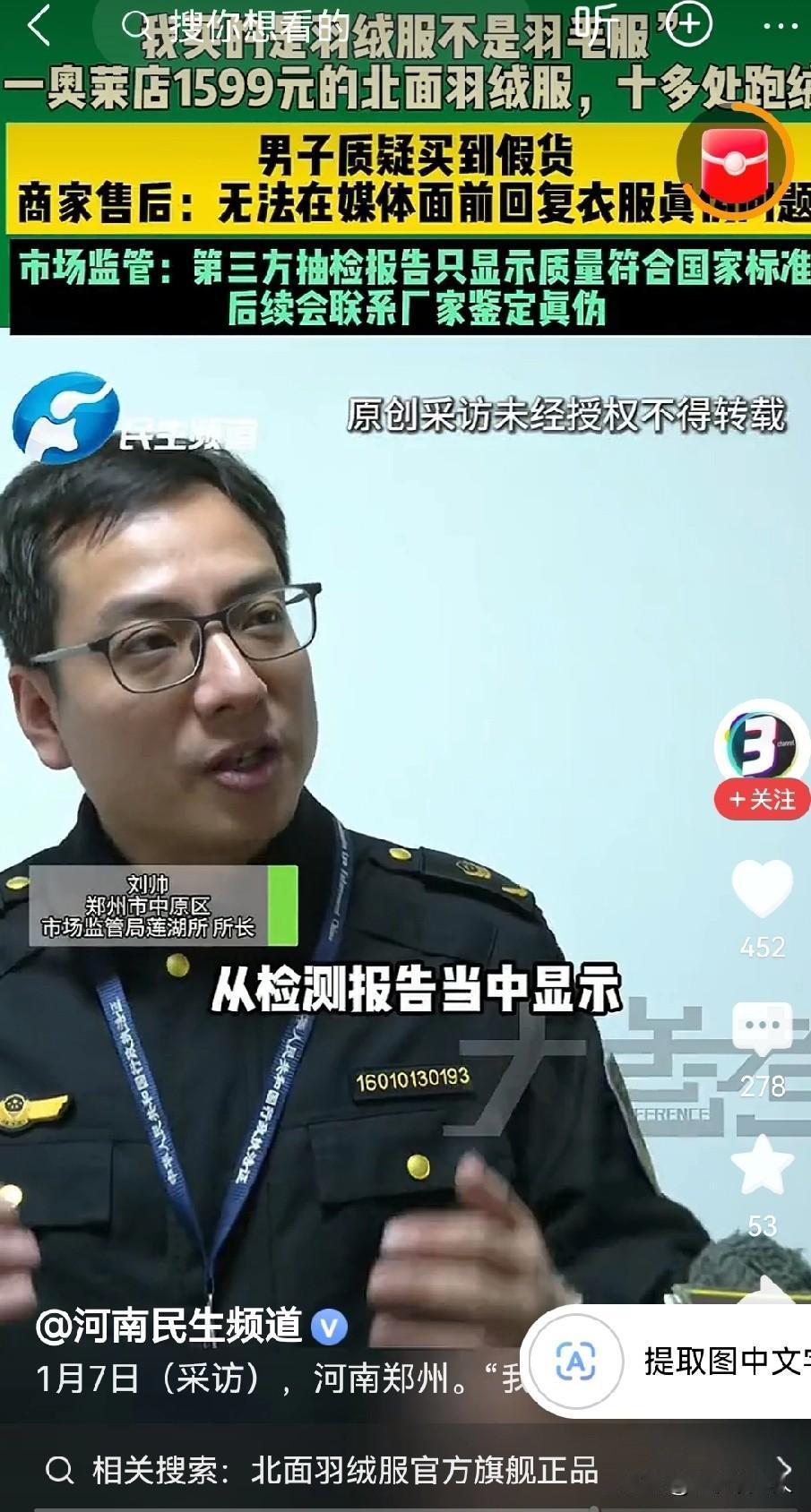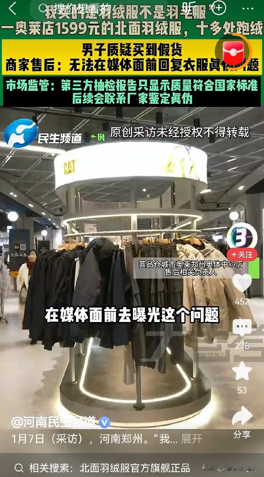 男子花1599元买北面羽绒服多处跑绒。 下雪了,天气寒冷了,每个人都想买一件质量好的,美观大方的,耐穿暖和柔软的羽绒服,熬过这个寒冷的冬天。 据媒体报道,郑州一男子于12月29日,在荟品仓城市奥体中心店,购买到一件价值1599元的北面羽绒服。 该男子穿在身上,出现10多处刨绒,有线头乱飞的现象出现,身边的人认为是高仿假货产品,让他颜面尽失。 因此,该男子向有关部门反映,怀疑该产品不是正品,是自己购买到了假货,是伪劣产品。 郑州市中原区市场管理局莲湖所表示,该羽绒服由第三方抽检,报告显示,该衣服质量符合国家标准。但是,该男子怀疑所购买到的北面羽绒服,是一件假冒伪劣产品。市场监管部门,需要联系厂家进行鉴定,判断是否真假,才能得出最后结果。 冬天天气寒冷,又临近春节年关,羽绒服市场生意十分火热,制造商们正在加班加点,赶做新的羽绒服,满足市场需求。销售商们忙着采购货源,积极组织销售促销,赚取高额利润。而在服装市场上的羽绒服销售柜台前,都是人头攒动,都想挑选购买到一件符合心意的美观大方的经济实惠的优质羽绒服。 这个时候就有很多不法分子,昧着良心,不顾消费者的利益,制造假冒伪劣产品,销售给消费者,以次充优,以假乱真,弄虚作假,鱼目混珠,欺骗消费者,坑害消费者的现象时有发生。 在春节年关之际,正是数九寒天,天气寒冷,是羽绒服消费火热的时候,想购买一件美观大方价廉物美羽绒服的消费者,一定要擦亮眼睛,认真检查,挑选优质合格的产品,千万不要贪图便宜,选购马虎,不认真挑选,就会上当受骗,购买到三无产品,假冒伪劣产品,谨防上当受骗。 以上是本人观点,如有不妥,请大家在留言区去和大家一起讨论。
