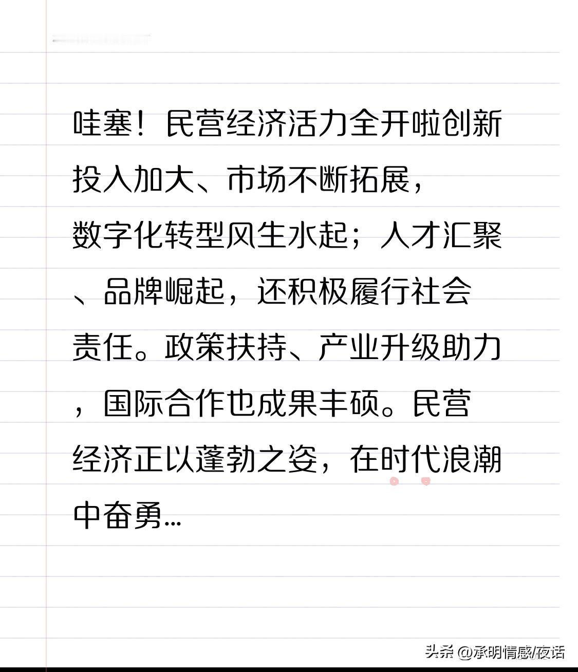 哇塞!民营经济活力全面迸发! 创新投入增加,市场持续拓展,数字化转型如火如荼;人才汇聚一堂,品牌崭露头角,还踊跃履行社会责任。政策扶持、产业升级助力发展,国际合作也收获颇丰。民营经济正蓬勃发展,在时代浪潮中奋勇向前,未来充满希望!