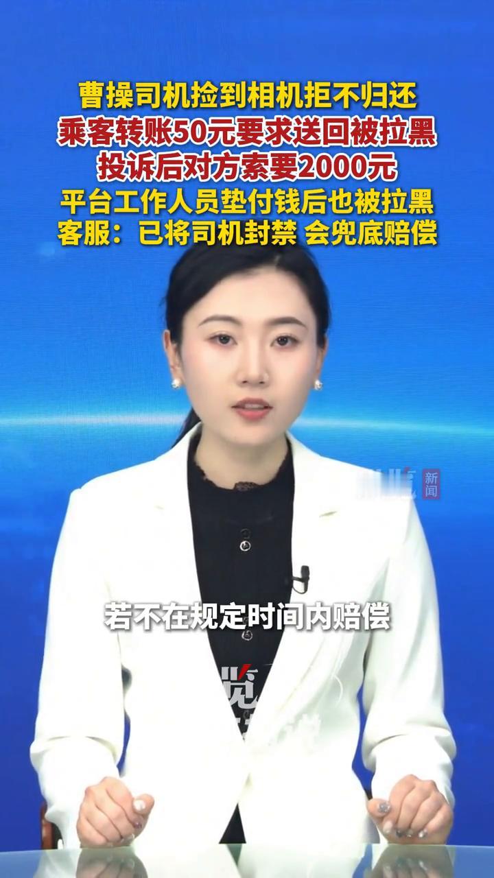 曹操司机捡到相机拒不归还,乘客转账50元要求送回被拉黑,投诉后对方索要2000元,平台工作人员垫付钱后也被拉黑。客服:已将司机封禁会兜底赔偿。 北京的付女士1月1日乘坐曹操出行网约车,不慎将价值3000余元的相机遗落在车内。付女士发现后与司机取得联系,双方加微信后,她立即转账给司机50元,并承诺司机送回后支付剩余50元。司机收款后并没有将相机送回,转而拉黑了付女士。 付女士向平台投诉后,司机主动联系她称,因为被投诉平台账号受限制,信誉分下降,无法接单,要求赔偿精神损失费、误工费、名誉损失2000元。司机表示,对相机没有保管义务,若不在规定时间内赔偿,就将相机丢弃。 1月4日,曹操出行客服人员告诉正在新闻,平台已对涉事司机账号进行永久封禁,并多次要求司机归还物品。此外,平台称示工作人员垫付一笔钱给司机,让司机尽快把相机送给乘客,司机收下后将工作人员拉黑。客服表示,平台将与乘客共同报警,同时承诺为司机的行为兜底,先赔付乘客的损失。曹操网约车平台 曹操网约车平台 曹操出租车 网约车丢物 曹操订单