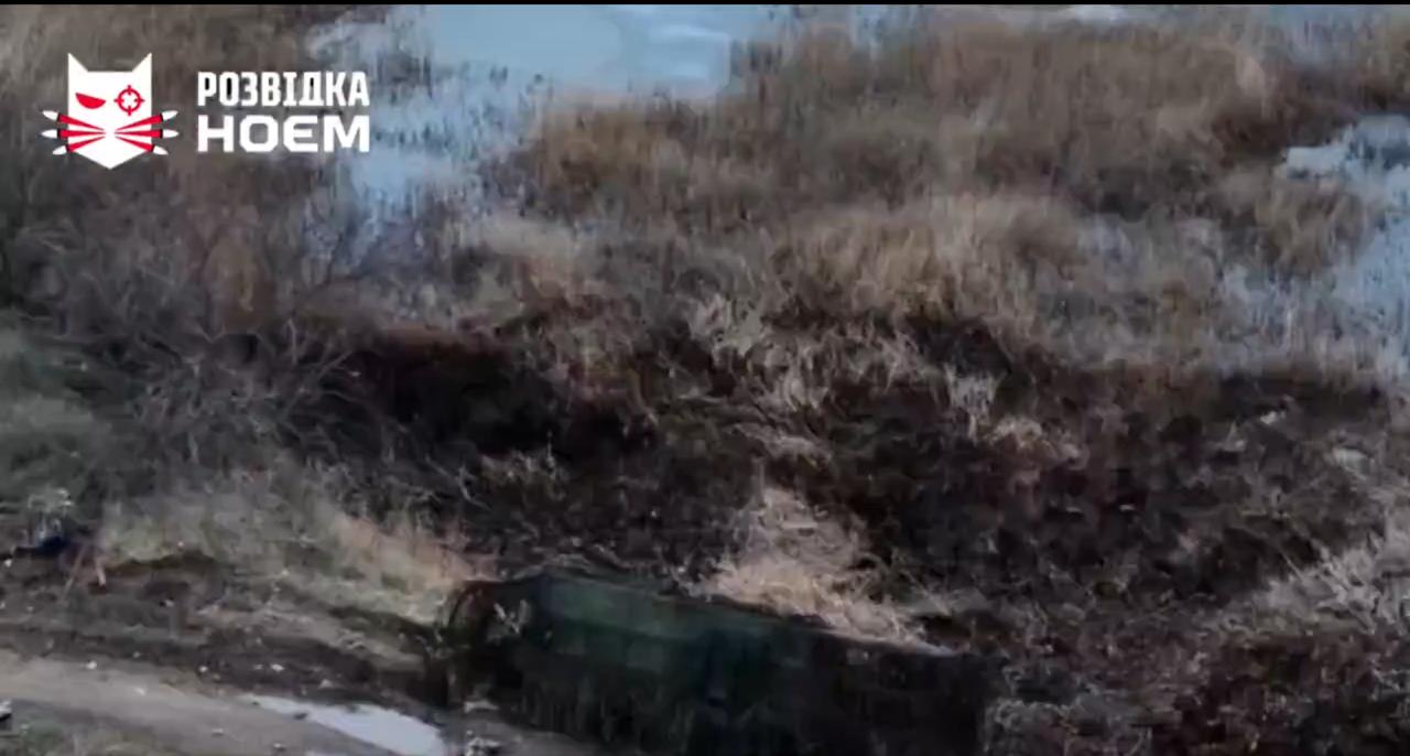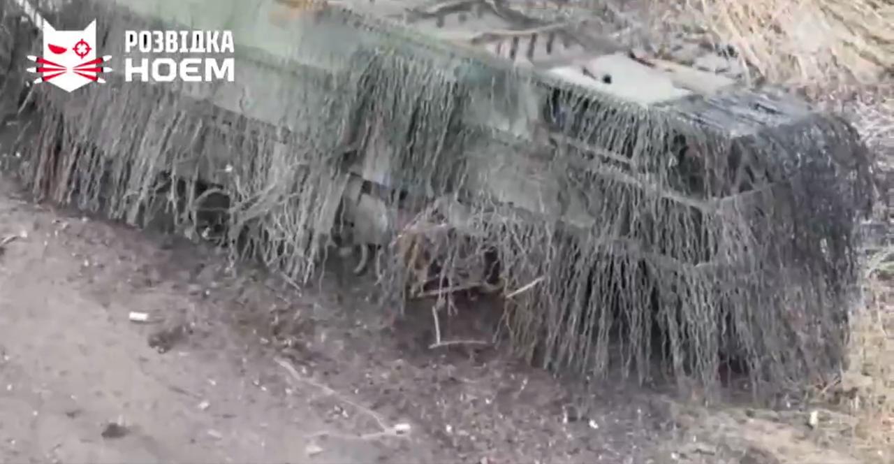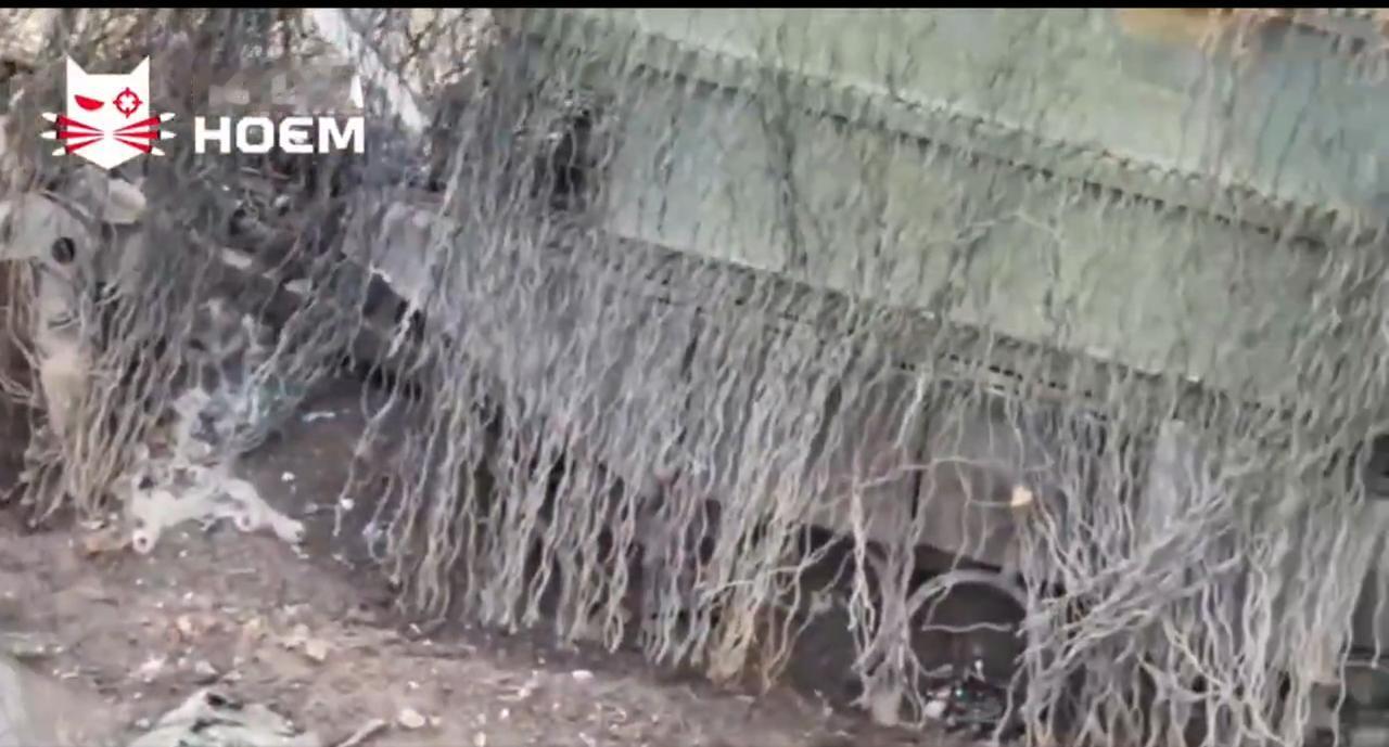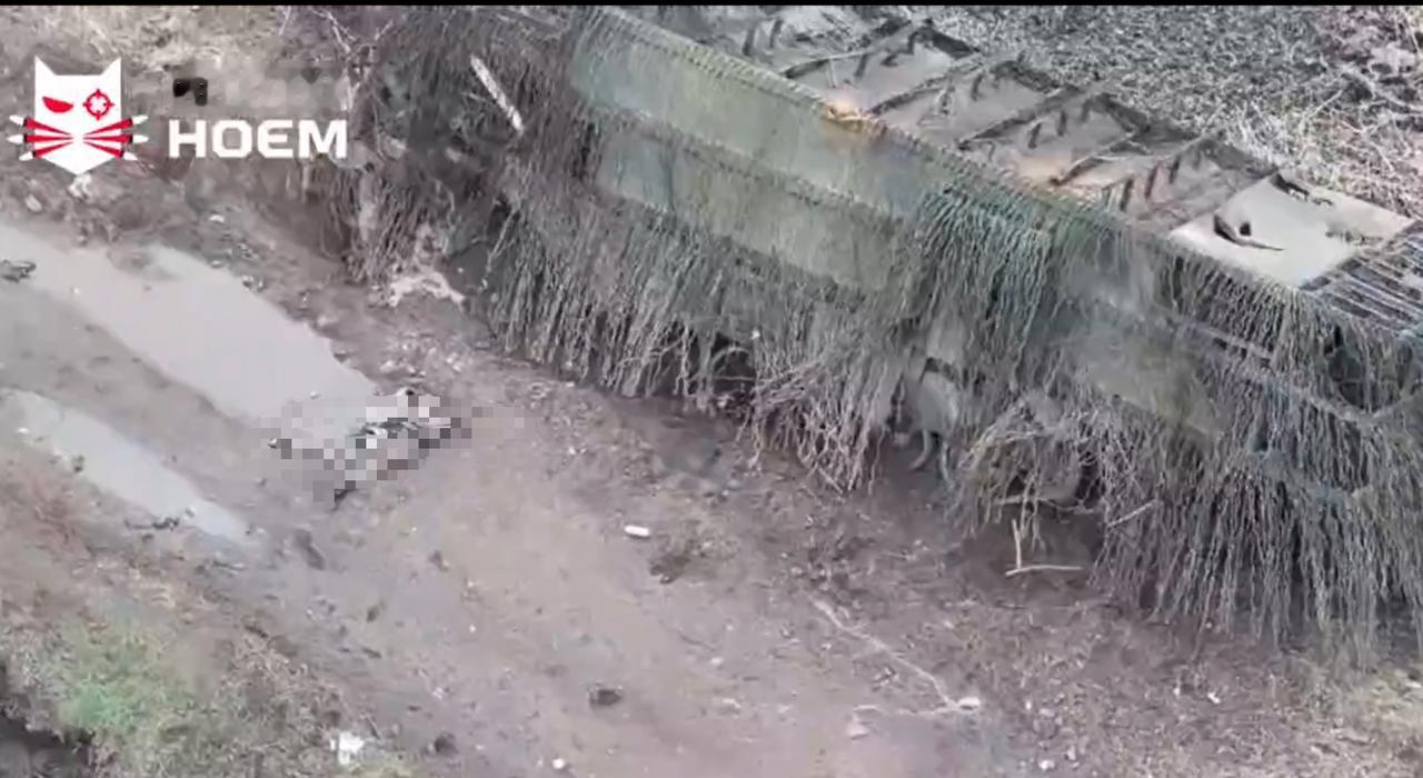 这可能是俄罗斯最长的龟式坦克之一。坦克车体上用红色矩形框标出。反无人机结构向后延伸了大约半个车体长度。 一辆被摧毁的俄罗斯“龟式坦克”,这是一款T-72坦克的改装版本,加装了一个超大的金属笼,长度超过车体一半,旨在对抗乌克兰的FPV无人机,附图中红色高亮显示的示意图便印证了这一点。 尽管在克拉斯诺霍里夫卡附近首次发现了2024年左右的反无人机改装方案,但其仍然存在漏洞。
