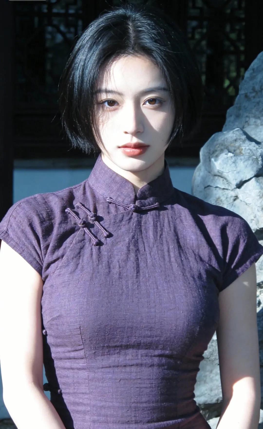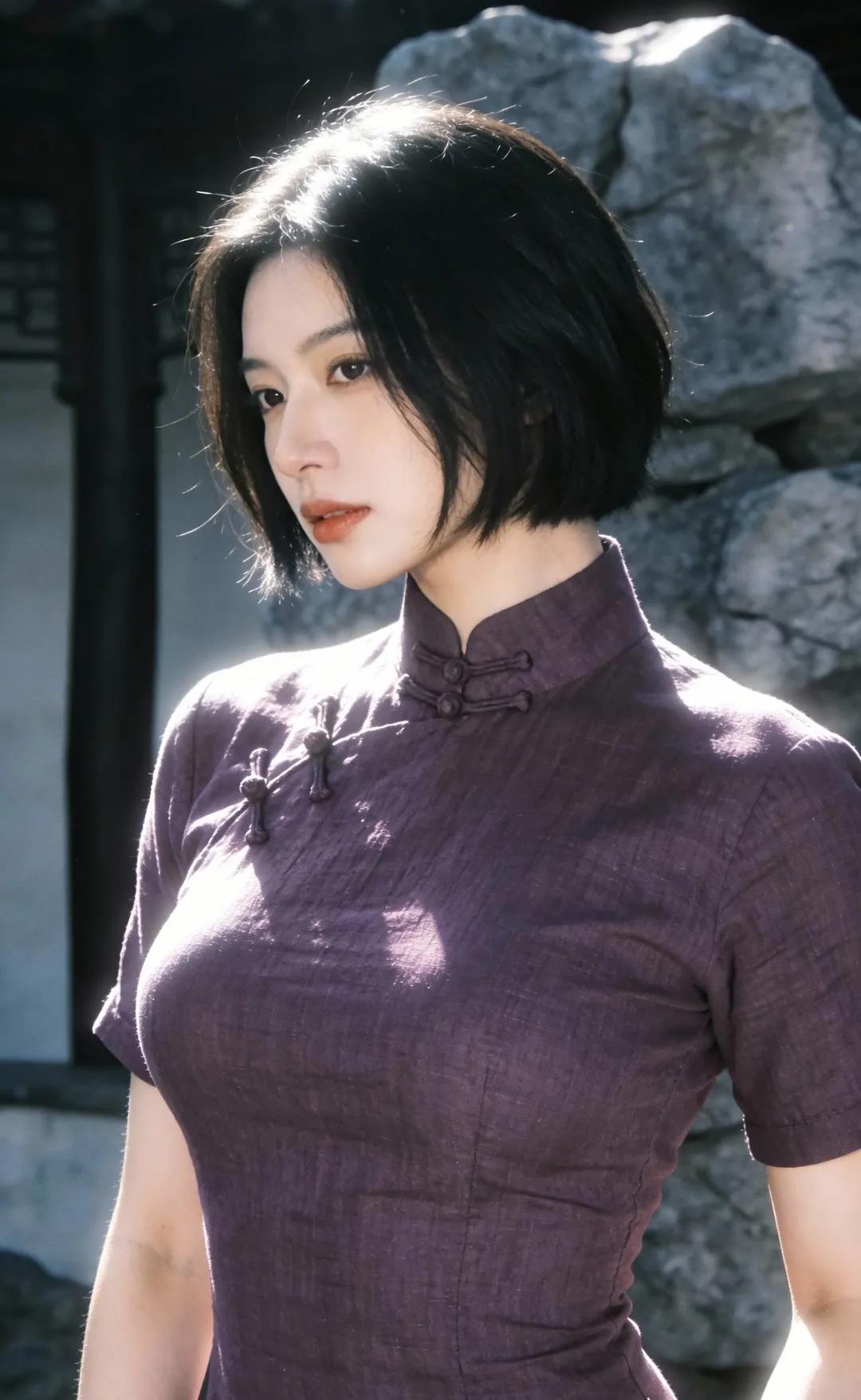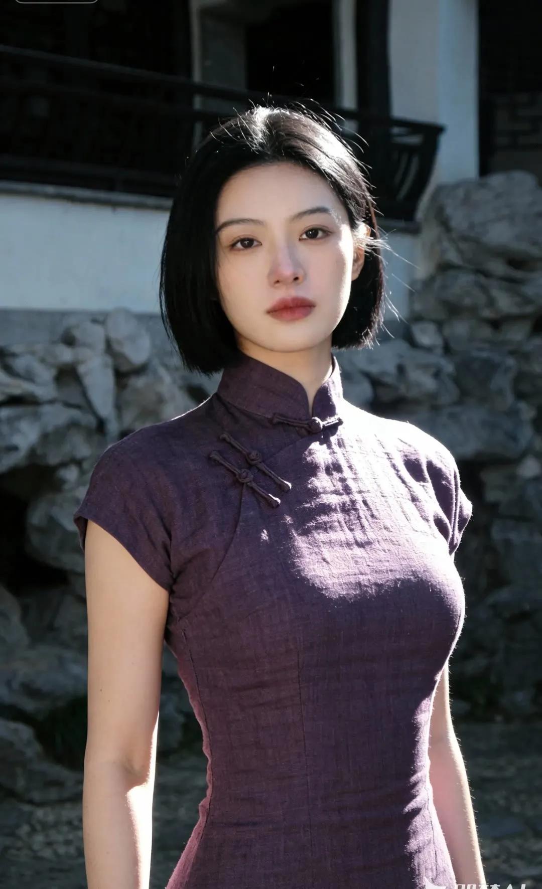优雅紫裙,石墙映衬,古典与现代的完美融合。