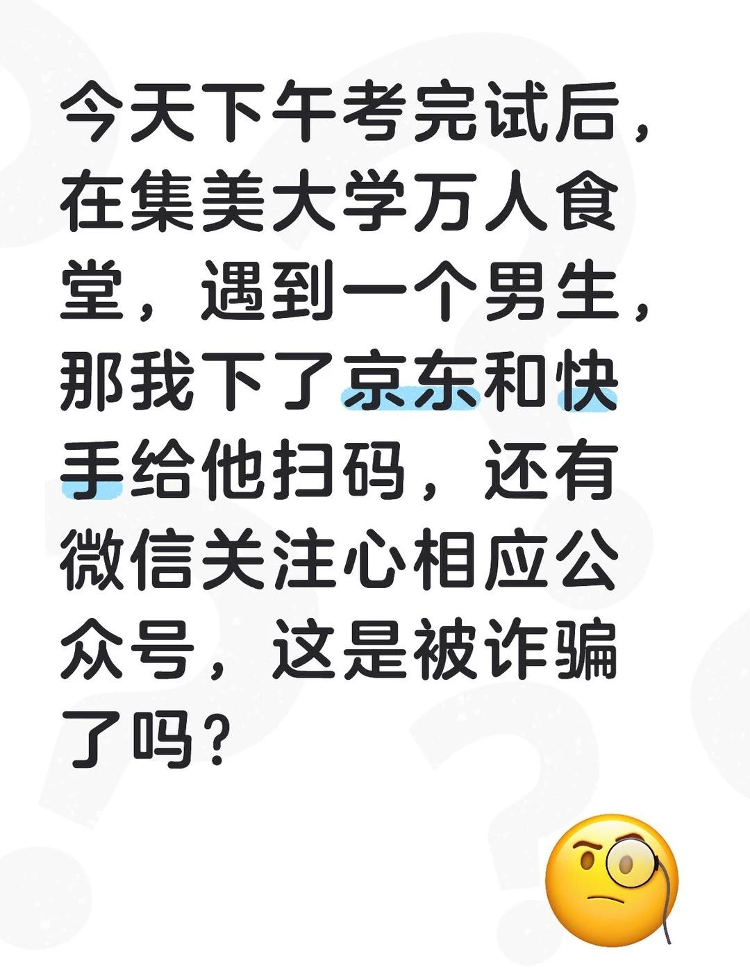 今天下午考完试后,在集美大学万人食堂,遇到一个男生,那我下了京东和快手给他扫码,还有微信关注心相应公众号,这是被诈骗了吗?
