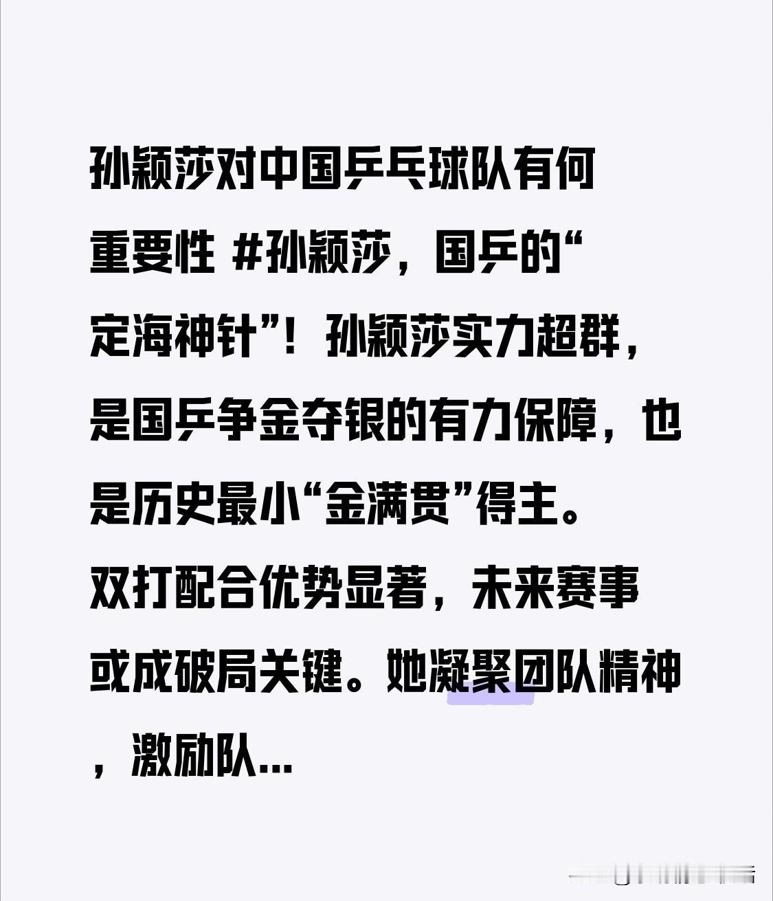 孙颖莎对中国乒乓球队有何重要性 孙颖莎,国乒的“定海神针”! 孙颖莎实力超群,是国乒争金夺银的有力保障,也是历史最小“金满贯”得主。双打配合优势显著,未来赛事或成破局关键。她凝聚团队精神,激励队友奋进。国乒新老交替之际,当打之年的她带领年轻队员,让国乒风采依旧!