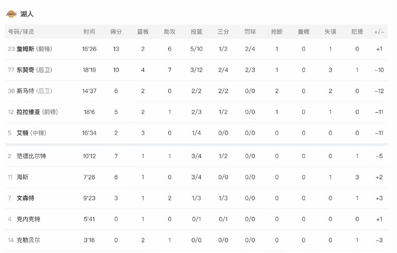半场结束,湖人52-61雄鹿。湖人这几个失误也太低级了吧,看的人头疼。 第一节,湖人还领先雄鹿1分,等于第二节被逆转了10分。 湖人旧帅汉姆依旧嚼着口香糖,看着这些旧将不知道是何想法。 湖人除了老詹一点看的激情没有,裁判允许对抗时还不上动作防守,等啥呢?