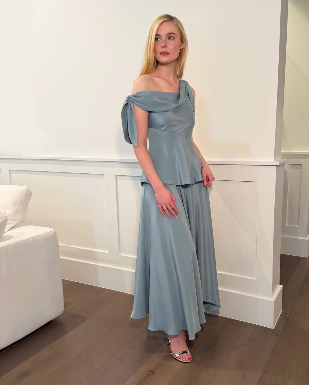 艾丽·范宁 (Elle Fanning) 在1月9日于洛杉矶举行的2026年好莱坞创意联盟Astra电影奖颁奖典礼上走红毯的照片。她身穿一件定制的Rodarte单肩柔和蓝灰色丝绸礼服,搭配银色高跟鞋。 范宁荣获先锋奖,以表彰她在Netflix的《平原女孩》(The Girl from Plainville) 和A24的《霓虹恶魔》(The Neon Demon) 等项目中作为演员和制片人的双重身份。