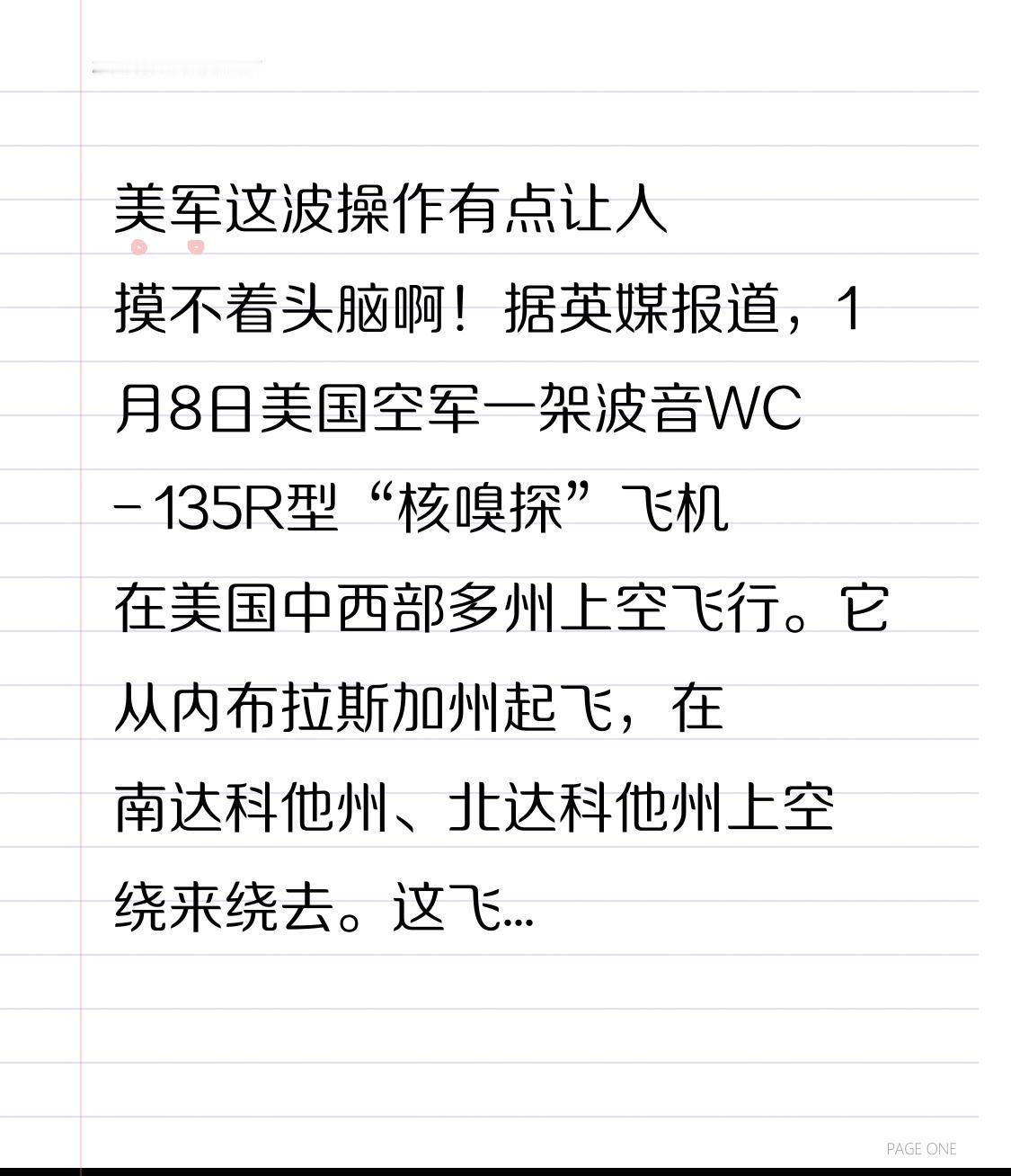 美军这波操作有点让人摸不着头脑啊!据英媒报道,1月8日美国空军一架波音WC - 135R型“核嗅探”飞机在美国中西部多州上空飞行。它从内布拉斯加州起飞,在南达科他州、北达科他州上空绕来绕去。 这飞机是经过特殊改装的,能采集大气样本探测核爆炸产生的放射性物质。一般这飞机在美国境内飞可能是机组训练、设备校准之类的。可这次飞行正值美俄《新削减战略武器条约》2月5日到期之际,特朗普之前还下令重启核武器试验,俄罗斯也暗示会采取相应行动。这就难怪引发观察人士担忧局势会恶化了,美军这是要搞啥大动作呢?