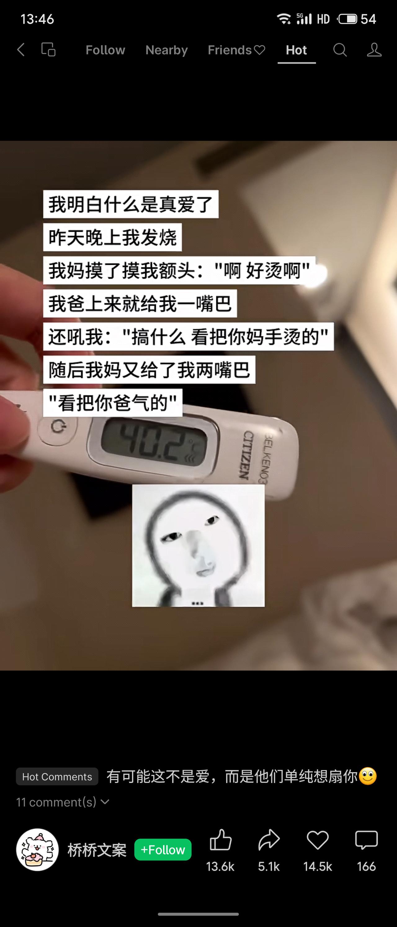 作者以黑色幽默描述发烧时的遭遇:母亲因手被额头烫到而惊呼,父亲随即扇其耳光责怪“烫到了妈妈”,母亲又补上两耳光斥责“气到了爸爸”。这段文字讽刺了一种以父母感受为中心、缺乏真正关爱的扭曲家庭互动。