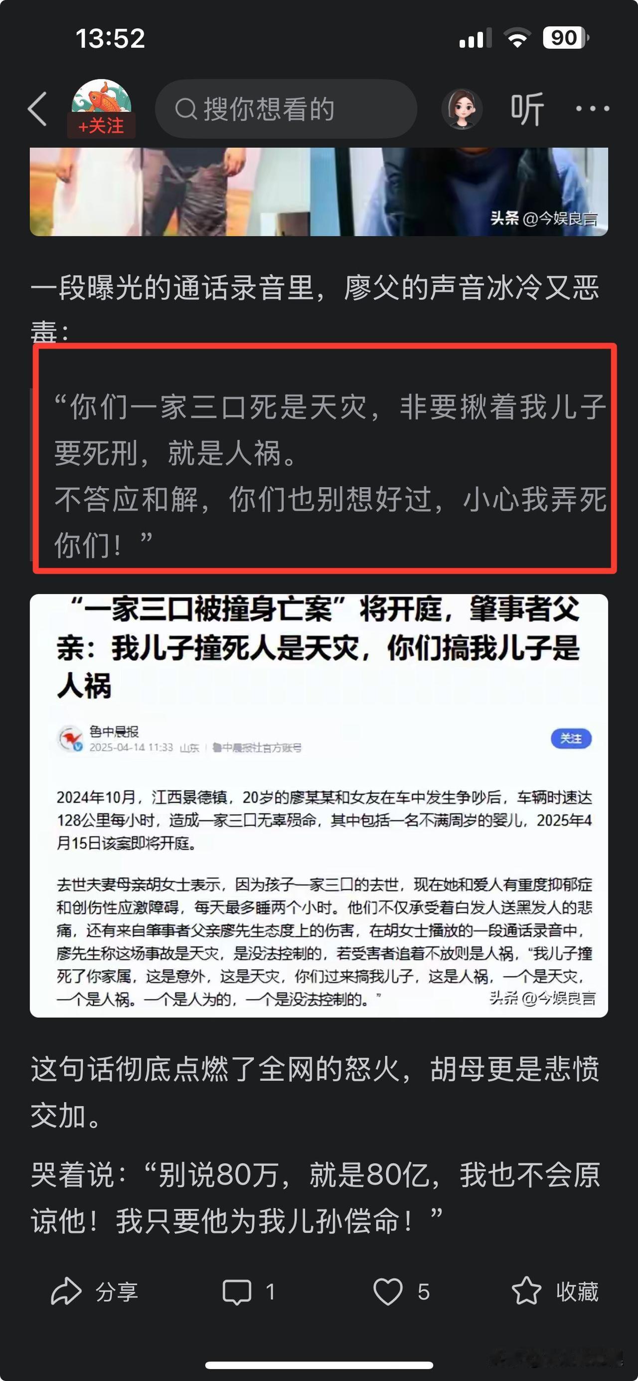 景德镇一家三口被灭门,凶手被判死缓,我突然不想说什么了 极度的绝望,面对这种违背人伦、灭绝人性的判决,看清楚,是判决,不是案件本身。 这个社会,出现任何恶性案件都不足为奇,毕竟这世上什么样的坏人都有,但法律,或者执法的人,如何履行法律,是这个社会的底线,是一个社会还能别成为人的社会的最低底线。 一家三口,就这样没了,11个月大的孩子,身子在车内,头颅滚落车底,何等惨烈,而肇事的凶手,并非无意的交通事故,是恶劣情绪爆发,仅仅因为和女友一句“鹦鹉是什么时候开始说人话”的争执,就在闹市区飙车,车速达到128.96km/h,导致发生这起惨烈的灭门大锅。 危害公共安全罪的最高处刑是死刑,结果,经过相关人员努力查找证据,终于发现了在撞上被害者的一瞬间,凶手踩过刹车,所以,唯一不死的理由找到了。 有了这个理由,凶手的父亲才有十足的底气去威胁被害人的父母。他认为法律都说我儿罪不该死,你们想弄死我儿子,我弄死你们全家!在朝堂之上,凶手及家人没有丝毫忏悔,反而叫嚣死者活该,任何一个作为“人”的生灵,都会忍无可忍,可偏偏握着匡扶正义之剑的人他能忍! 所以,还能说什么? ——————————
