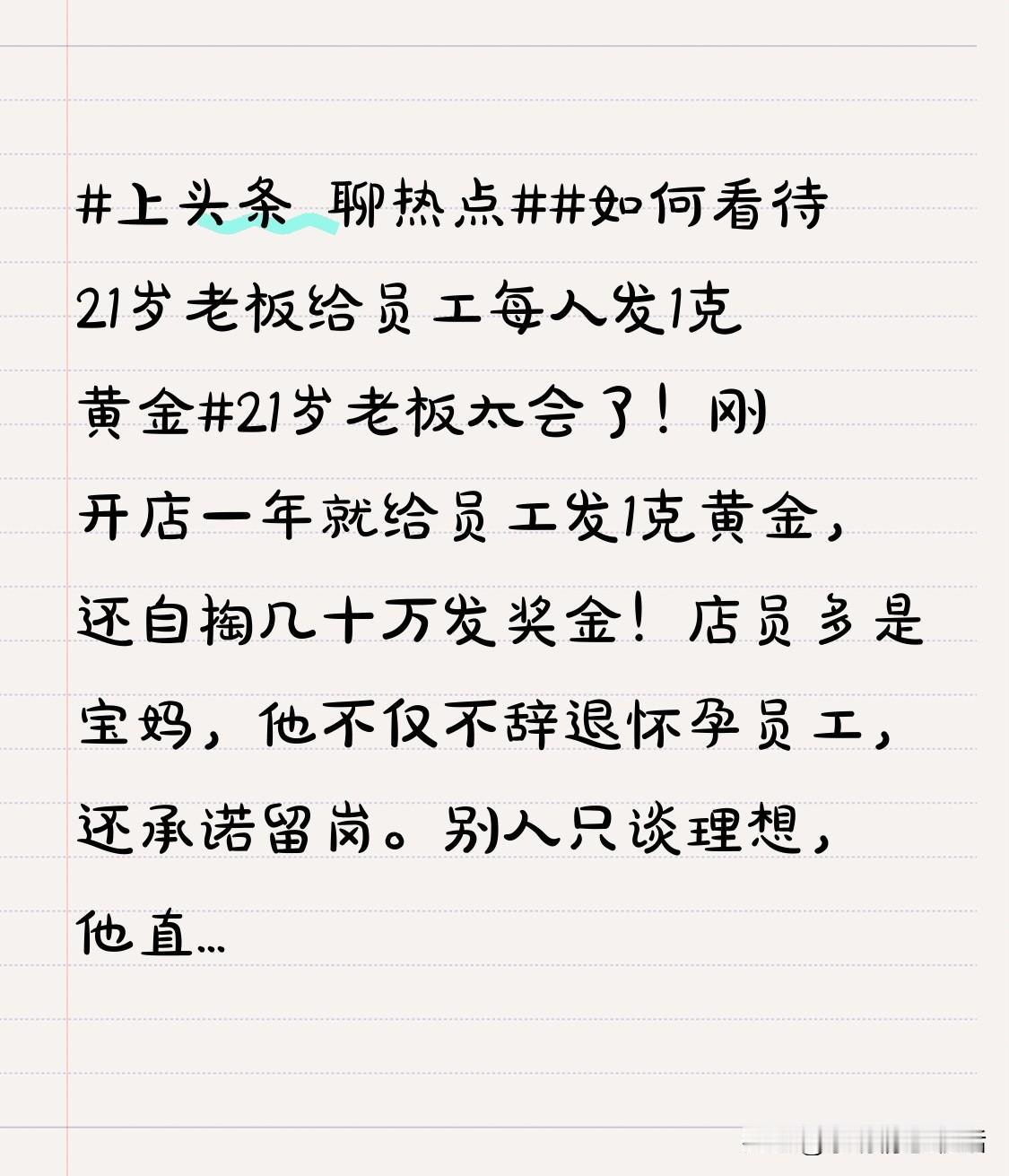 如何看待21岁老板给员工每人发1克黄金21岁老板太会了!刚开店一年就给员工发1克黄金,还自掏几十万发奖金!店员多是宝妈,他不仅不辞退怀孕员工,还承诺留岗。别人只谈理想,他直接“真金白银”留人,难怪网友直呼:这格局,活该他赚钱!年轻创业者都该学学,共富才是长久之道!