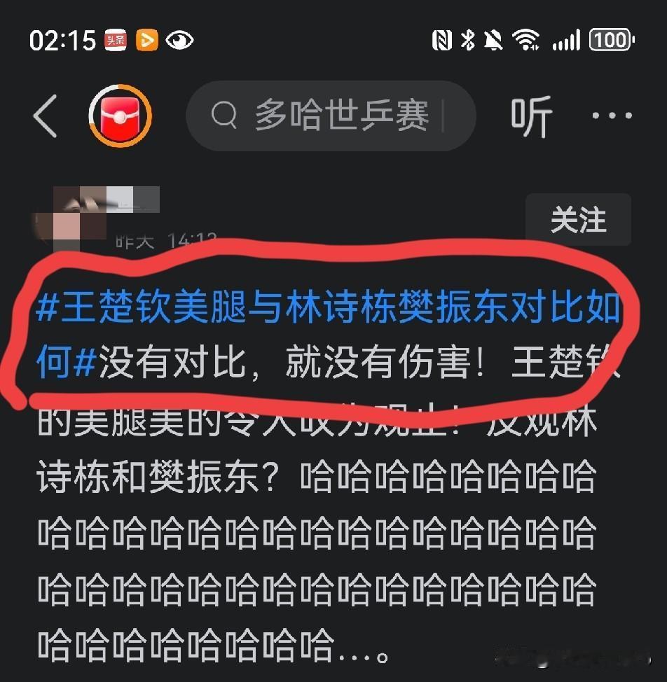 不谈王楚钦的伤势, 不讨论王楚钦的技战术, 不分析王楚钦为啥退赛多哈冠军赛 不展望王楚钦下月亚洲杯复出表现, 却单单拿出王楚钦——一个大男人的腿、还是“美腿”来说事。 要命的是,还专门和身材较矮的樊振东、林诗栋做比较。 这真是夸谁都不是不夸也不是! 问题是:比美腿不应该是女生专利吗?男人比也应该比胸肌、比腹肌吧!