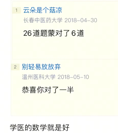 26道题蒙对了6道, 恭喜你对了一半 学医的数学就是好