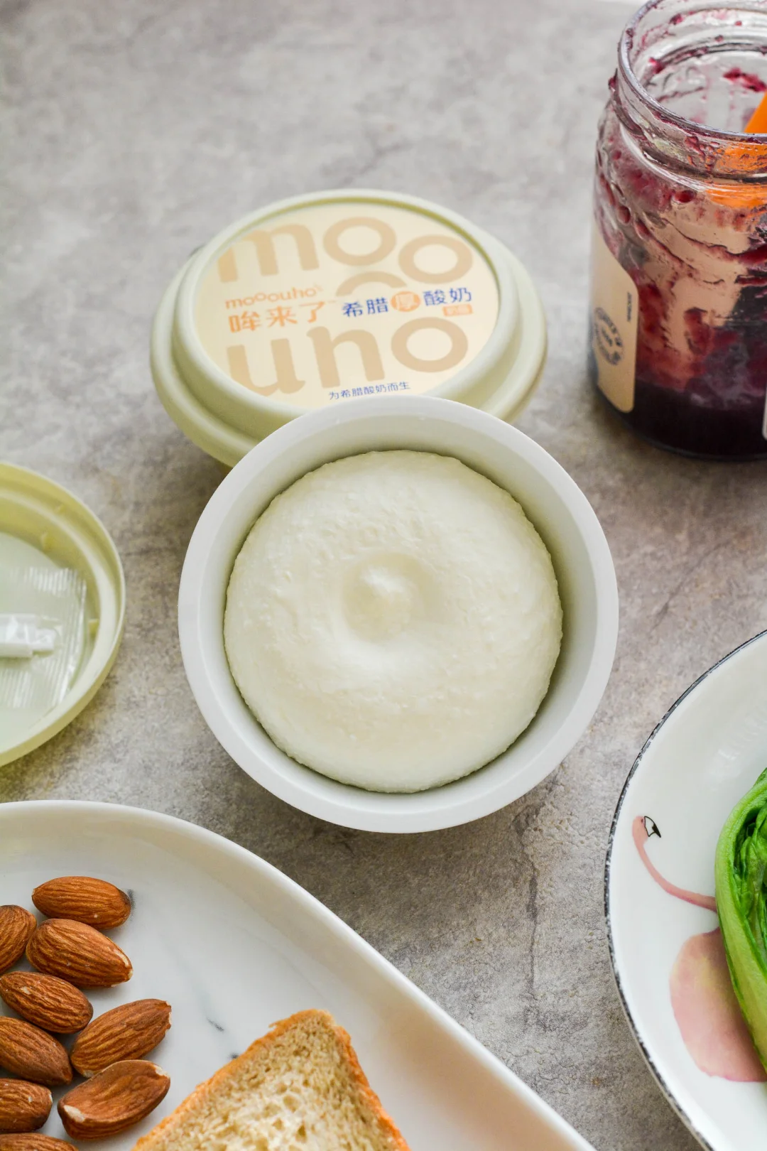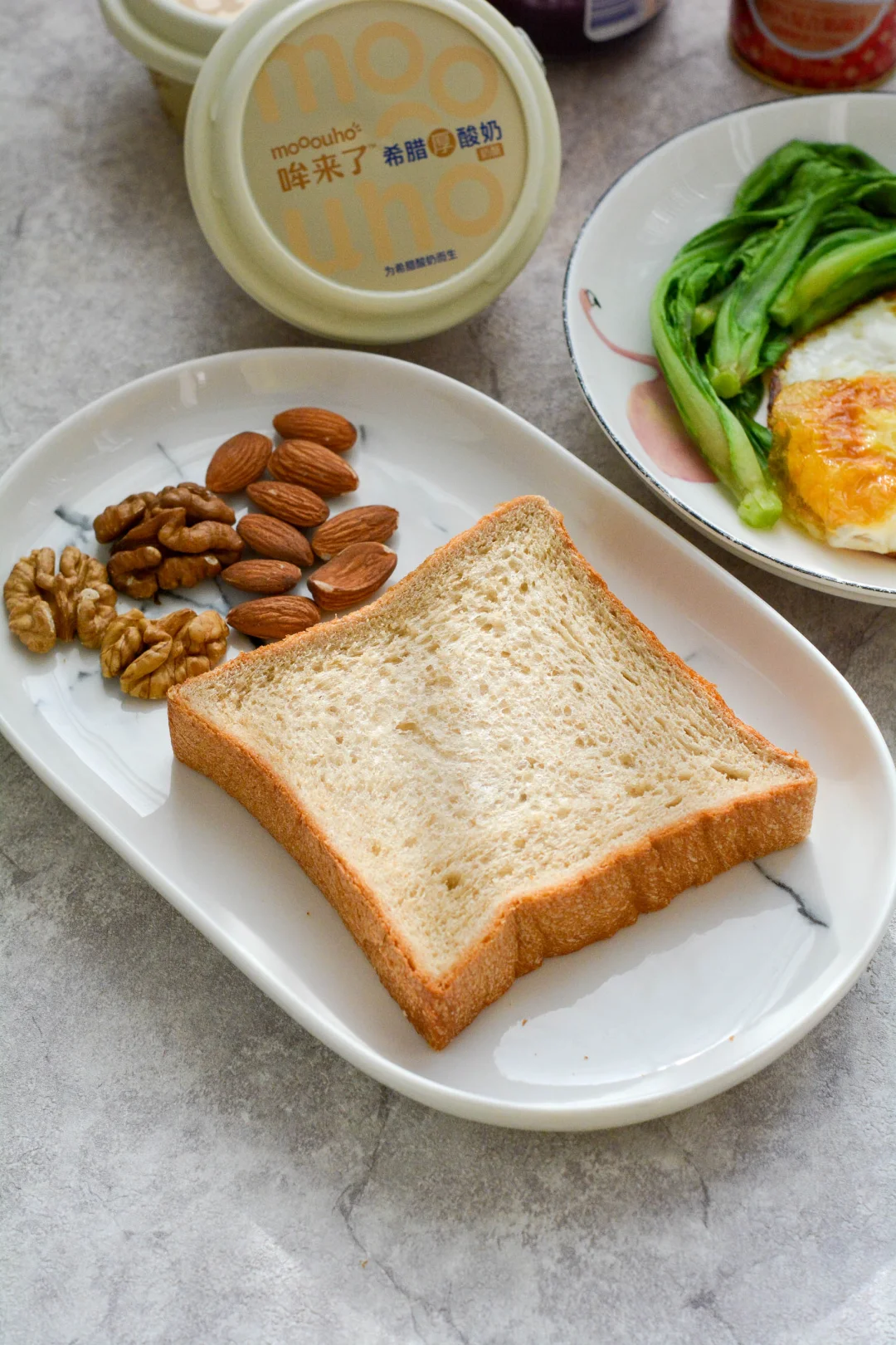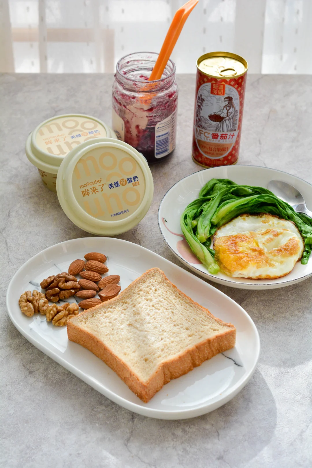早餐一人食,10分钟轻松搞定 全麦吐司+希腊厚酸奶+煎蛋+煮青菜+番茄汁+坚果 花几分钟煎个蛋,焯几根青菜 吐司抹上哞来了希腊厚酸奶 再淋几道蓝莓果酱 甜咸酸脆嫩滑焦 丰富的口味和口感 打开清晨慵懒的胃口