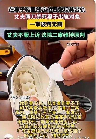在妻子鞋里放定位器,男子两刀杀死第三者后被判无期!情绪管控真的太重要了! 2026年1月9日,广东省高级人民法院的一则终审判决引发热议:男子陆某因在妻子鞋内放置定位器发现其出轨,持刀杀死妻子的出轨对象庄某,最终被判处无期徒刑,剥夺政治权利终身。 案件的根源始于一段充满猜忌的婚姻。陆某与妻子黄某的感情早已出现裂痕,陆某长期怀疑黄某存在不正当男女关系,却始终没有证据能够证实。为了查清真相,他采取了侵犯隐私的极端手段——在黄某的鞋内秘密放置了一台带有监听功能的定位器,实时监控妻子的行踪与言行。 2024年6月,定位器传来的内容让陆某彻底崩溃。他通过设备清晰听到黄某与陌生男子的亲密对话,猜忌被证实的愤怒与屈辱感交织,让他萌生了“教训”对方的念头。6月16日中午,陆某通过定位器得知黄某正与该男子在一起,便将提前准备好的剔骨刀放入电动车尾箱,做好了报复准备。 当日下午6时许,陆某循着定位追踪至深圳市宝安区某路段,远远看到黄某与男子庄某手牵手散步的亲密场景。积压的怒火瞬间爆发,他抽出剔骨刀径直冲向庄某,对着其背部狠狠捅下一刀。庄某转身之际,陆某又补刺一刀,致其当场倒地。作案后,陆某一直待在现场,主动拨打报警电话等候处理 。 经法医鉴定,庄某因锐器作用于胸腹部,导致左肺、胸主动脉等多处重要脏器破裂,最终因大出血死亡 。一审法院审理认为,陆某的行为已构成故意伤害罪,但其作案后自首、如实供述罪行,故判处其无期徒刑。陆某不服上诉,广东省高级人民法院二审驳回上诉,维持原判。 婚姻中最重要的就是信任和忠诚,黄某与庄某的不正当关系突破了道德与婚姻的底线,成为悲剧的直接导火索,而陆某的行为,无疑是将自己推向了犯罪的深渊,既然婚姻失去了最本真的模样,那就好聚好散,因为一时冲动换来的是终身牢狱之灾,也让两个家庭陷入无尽悲痛。这件事情再一次告诉我们,情绪管理的重要性,我们要做自己情绪的主人,而不是被坏情绪操控,做出两败俱伤的行为!