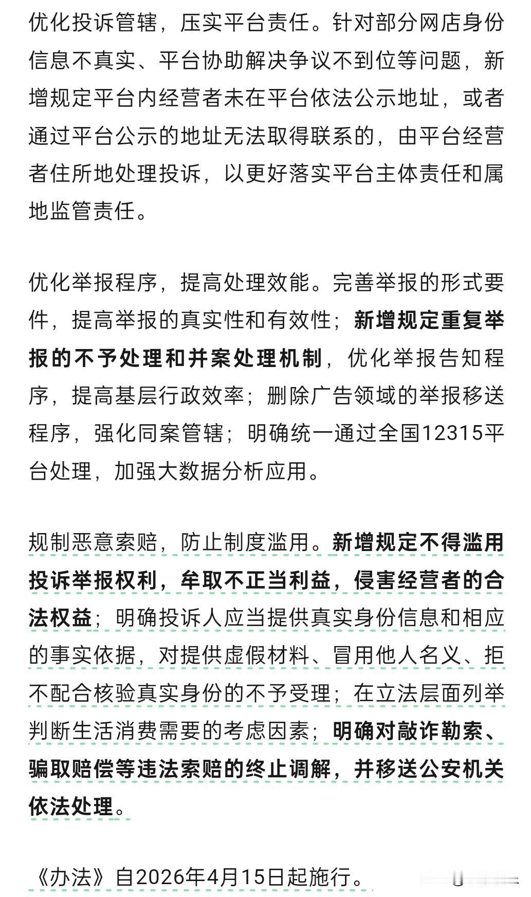 “这个新规与你我息息相关,”将于2026年4月15日起实施! 简单说,市场监督总局出了个新规定,主要想管两种人: 1. 专门“碰瓷”的“职业索赔人”:以后这条路不好走了。 以前有些人,专门找商品包装上一个错字、广告里一句话的毛病,然后大批量买、举报,主要目的不是解决问题,而是敲商家一笔钱。这搞得很多商家,特别是小店主,很头疼,也浪费了政府很多精力去处理这些“假投诉”。 现在新规明确: 不能靠这个赚钱:你要是以牟利为目的、搞“碰瓷式”投诉,不行了。 身份要真实:投诉得用真名实姓,弄虚作假的不受理。 太离谱的直接送公安局:如果查实是敲诈勒索、骗钱,就不只是调解了,会直接交给警察处理。 2. 对于咱们普通消费者:放心,维权完全不受影响,可能还更快了。 你正常买东西遇到质量问题、商家欺诈,该投诉投诉,一点事都没有。新规反而要求平台和商家更负责,处理流程也优化了,让真问题能更快解决。 打个比方:这个规定就像个筛子,把那些借维权之名、行讹诈之实的“职业碰瓷党”筛出去、管起来;同时把筛眼清理干净,让真正需要解决的消费纠纷能更顺畅地通过和处理。 所以核心就是:保护老实人,收拾搞乱的人。