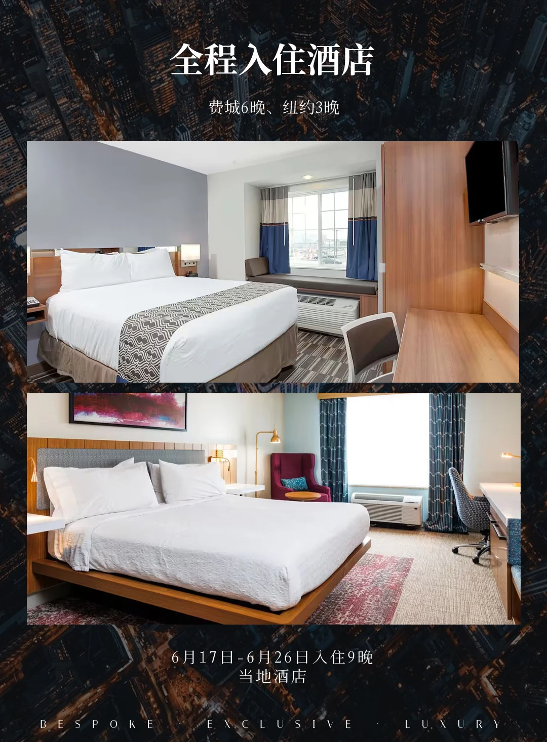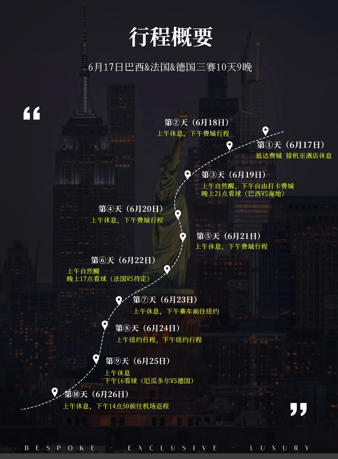 今天78就给追求性价的铁子们设计了一套10天9晚的世界杯定制行程,人均3个💰就能看3场热门赛事(包括巴西、法国和德国的比赛)性价比真的很能打!行程覆盖7晚酒店、接送机、比赛日往返,以及费城—纽约全程包车,专车独享拒绝拼车,舒适度拉满!决赛门槛太高没关系,小组赛一样看得爽✌️