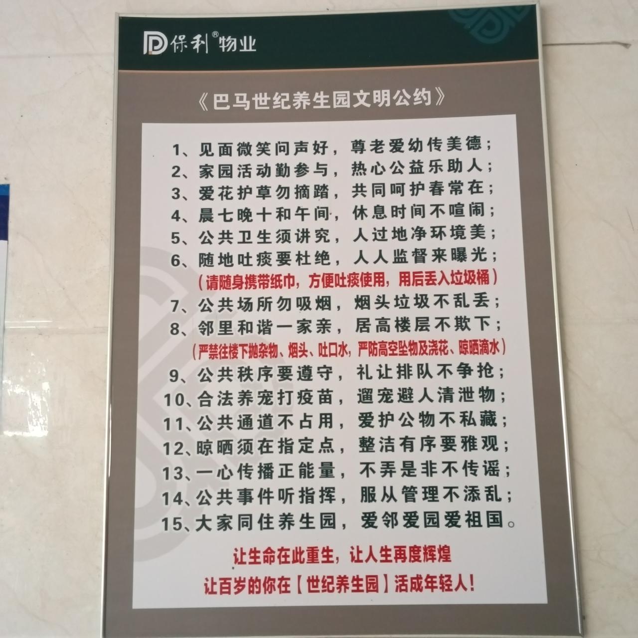 物业的贴心也是 房产销售的法宝 今天应朋友邀请我们来到了巴马下村的世纪养生园。 楼门口的景色就很美好,加上一进门物业宣传版中的两段提示语,更让我觉得朋友来这里租住是值得的。 无论在哪里住,外部环境很重要,而人文环境就更重要。 物业编的顺口溜很有意思,很贴心,也很有启发。录两段给朋友们欣赏: 1、见面微笑问声好,尊老爱幼传美德。 注: 读到这一段,我有一个深刻的体会。国人性格多为腼腆,在陌生人与之打招呼微笑问好的时候,很多人会流露出尴尬和不解的表情。 但有了以上这样经常的提点,可能就会好一些,慢慢就会接受了。 2、一心传播正能量,不弄是非不传谣。 出来康养的人居住在康养小区里,多数都是中老年人习惯上的拉家常少不了,但有了这样的提点可能是非就会减少甚至避免。 这家物业让我喜欢。可能也成为我们准备考察和入驻世纪养生园的又一个理由吧。