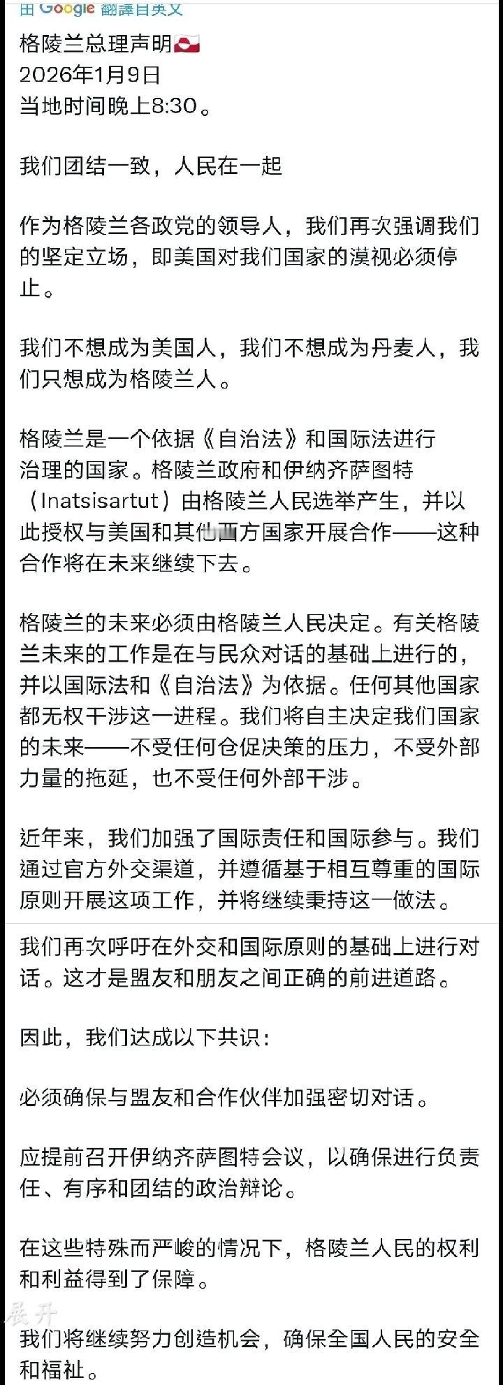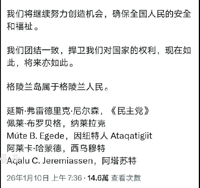 伪君子式侵略,格陵兰岛 请看报道,这是美国前驻华大使,现任北约大使 尼古拉斯•伯恩斯 1月10日发文:“我们很荣幸能加入这场捍卫我们与丹麦历史悠久的北约联盟,反对美国入侵格陵兰岛和胁迫丹麦政府的行动,我们是15位曾任共和党和民主党政府高级官员的联合阵营。” 格陵兰总理 1月9曰 发文捍卫格陵兰岛的主权。 上述两条资讯,个人认为:美国外交官认为,美国应该采取道貌岸然,冠冕堂皇的理由“占有”格陵兰岛,而不是像现在这样,简单粗暴的直接抢夺侵占,格陵兰岛。引起格陵兰岛的上下一体的抵触。引起全世界的关注。 很显然,美国的外交官们认同“美国优先的霸权思想”但是不认同美国的霸权手段— 西部牛仔式的直接动手侵略。