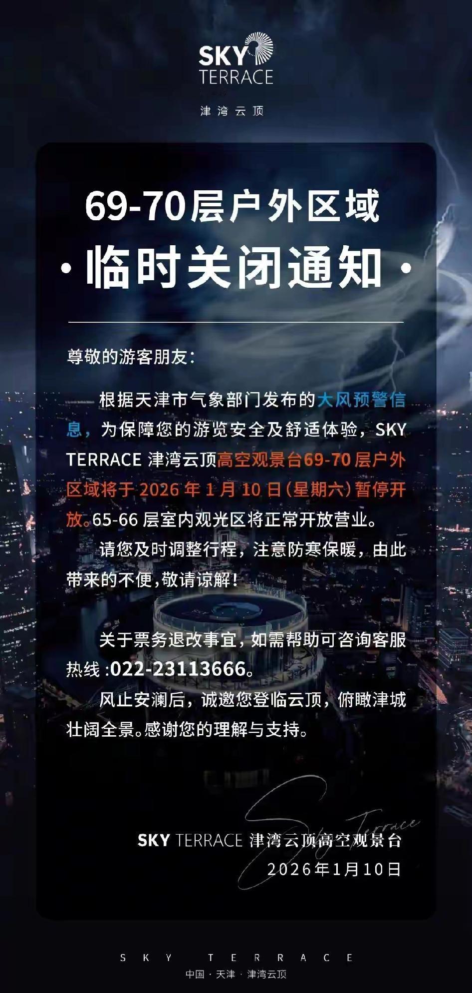 注意!今晚想去云顶的游客们换个日子吧,受大风降温影响,室外部分已经不能出去了。天津 天津百姓身边事 天津云顶观光暂停