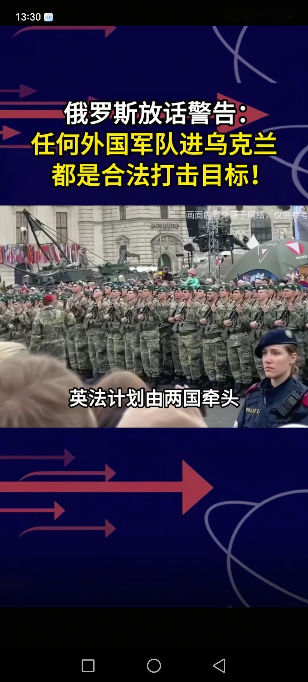 任何外国军队进驻乌克兰都是合法打击,英国,法国还有其他国家,总想派军队进驻乌克兰。来保障乌克兰的和平,但对于俄罗斯来说,这是一个威胁,这等于把北约军队部署到俄罗斯家门口,枪口直接对准俄罗斯。俄罗斯绝对不能容忍,所以说才放出狠话,一旦进入乌克兰,就不排除武力直接打击。乌克兰这场冲突,何休何止。美国想让他结束俄乌冲突,欧洲不想结束,乌克兰也不想结束,俄罗斯也不想结束。因为都没得到满足,满足自己需要的条件,欧洲就不得不继续援助武器和经济援助,乌克兰继续消耗自己的人力资源,俄罗斯继续打,这场仗打不起,打打起打,直到打服方为止。