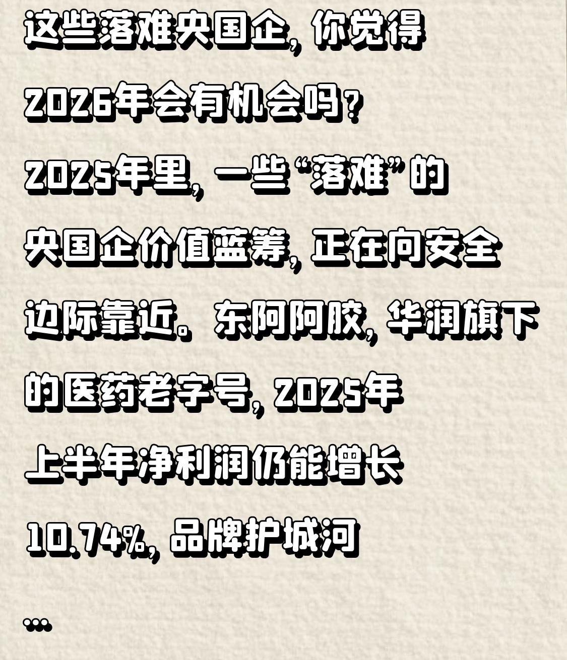 这些落难央国企,你觉得2026年会有机会吗? 2025年里,一些“落难”的央国企价值蓝筹,正在向安全边际靠近。 东阿阿胶,华润旗下的医药老字号,2025年上半年净利润仍能增长10.74%,品牌护城河深厚,股价全年跌超21%。 中国移动更不用多说,年赚超千亿,分红稳定得让人安心。2025年上半年838亿经营现金流、255亿自由现金流,股息率近5%。这样的现金奶牛,股价却跌破横盘区间。 还有中国建筑,基建与地产双龙头,市净率仅0.44、市盈率4.79,股息率5.24%。即便行业短期承压,但其扎实的经营根基并未动摇。 市场总爱追逐短期热点,但真正的机会,往往藏在这些被低估的优质资产里。你觉得这些蓝筹股,2026年会有机会吗? 央国企机会 东阿阿胶