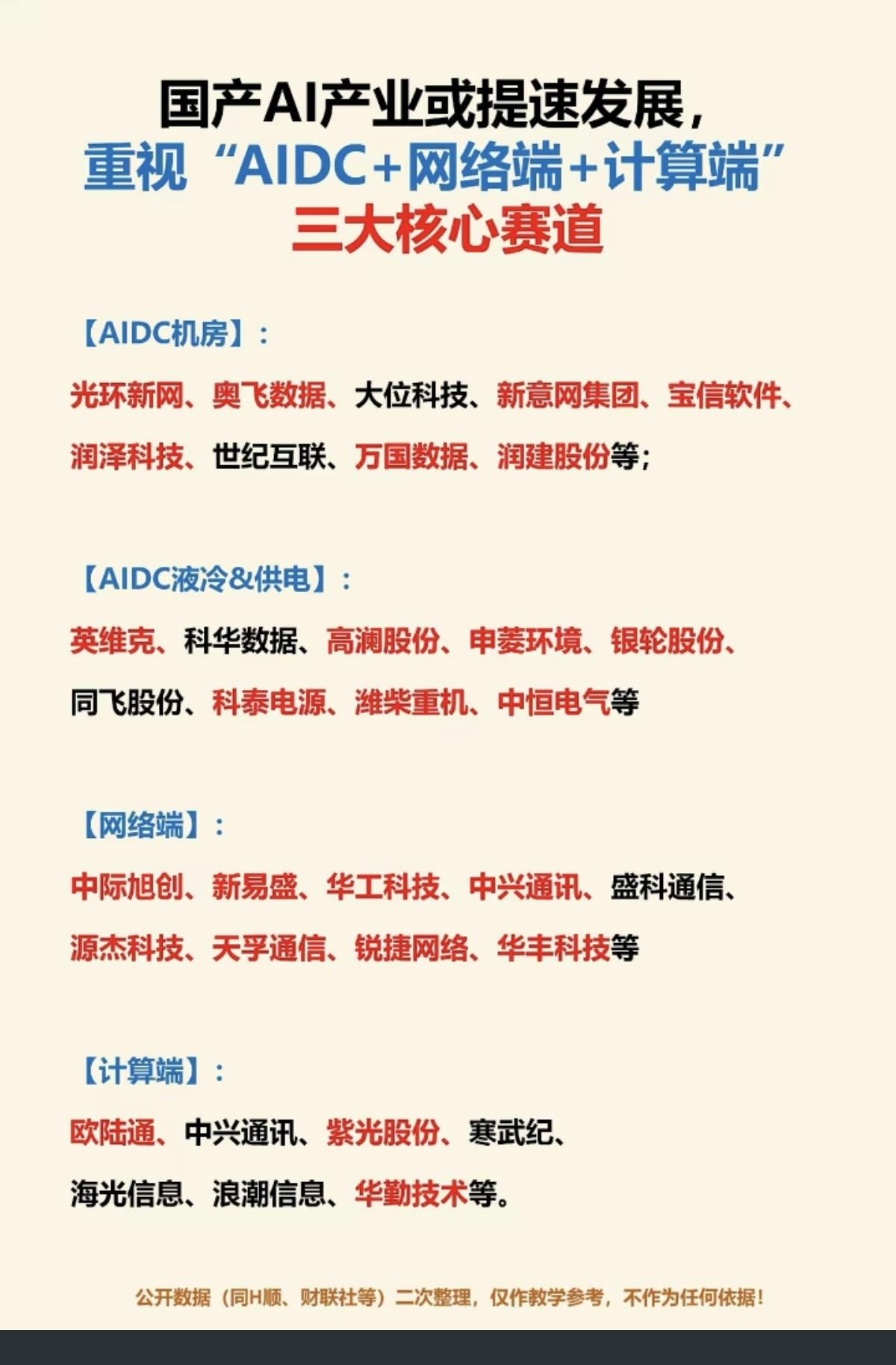 国产AI产业或提速发展! 重视“AIDC+网络端+计算端”三大核心赛道 AI可能是未来1~2学,包括春节期间主题 1.AIDC机房 2.AIDC液冷+供电 3.网络端 4.计算端 相关核心龙头股: