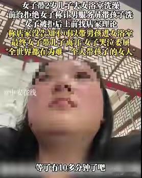 对于女子带两岁儿子进女浴室开始还很同情,但知道细节后,可以说好感瞬间全无。 浙江这个女子带儿子进女浴室洗澡被拒,并在网络上哭诉“全世界都在为难一个人带孩子的女人”。 其实工作人员是给出了解决方案,由男服务员带孩子洗,这个方案很完美啊,既避免了其他女宾的尴尬,又能让孩子也洗了澡,完全是一举两得。 但是该女子死活不同意,并埋怨商家并没有提前告知不能带小男孩进入女浴室,最后发视频哭诉,没想到却引来了大量的指责,从网友的态度完全能够说明她的做法是对是错。