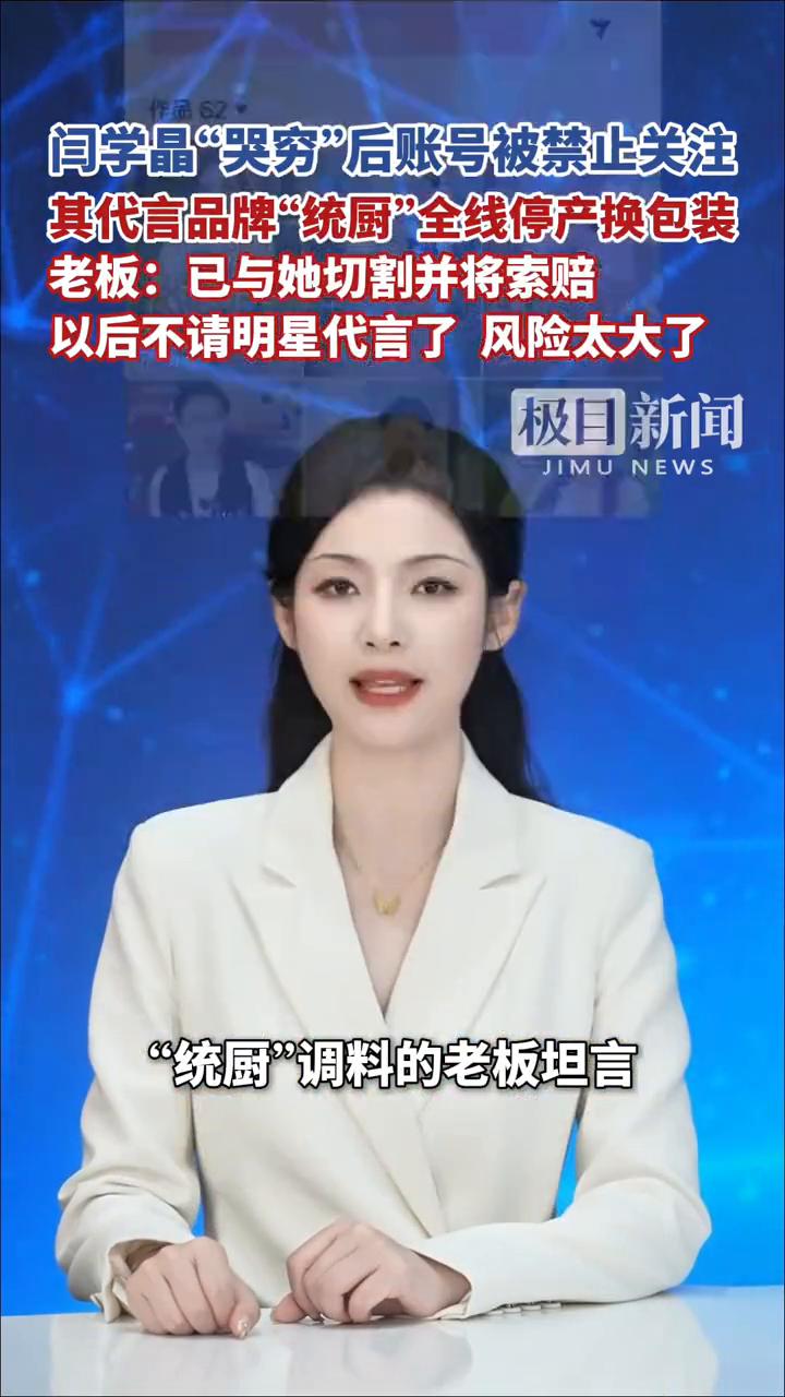 闫学晶"哭穷"后账号被禁止关注,其代言品牌"统厨"全线停产换包装。老板:已与她切割并将索赔。 我不是怂的人,爱咋咋地。再也不请明星代言了,风险太大了。 闫学晶"哭穷"言论事件后,多平台账号被禁止关注其代言品牌"统厨"调料的老板坦言,这次品牌被网友抵制真的很无。 1月10日,该品牌负责人张先生称,公司已做出与闫学晶切割的决策,不再使用她的形象。在产品包装上,目前公司产品全线停产,正加班加点做新包装。等新包装做好之后,公司再恢复生产,而且公司也在清点损失。今后会向闫学晶方追责,索要包装弃用、短期停产、名誉损害等经济损失。 张先生说,以后不考虑再请明星代言了,还是踏踏实实做产品,我们自己给自己代言。