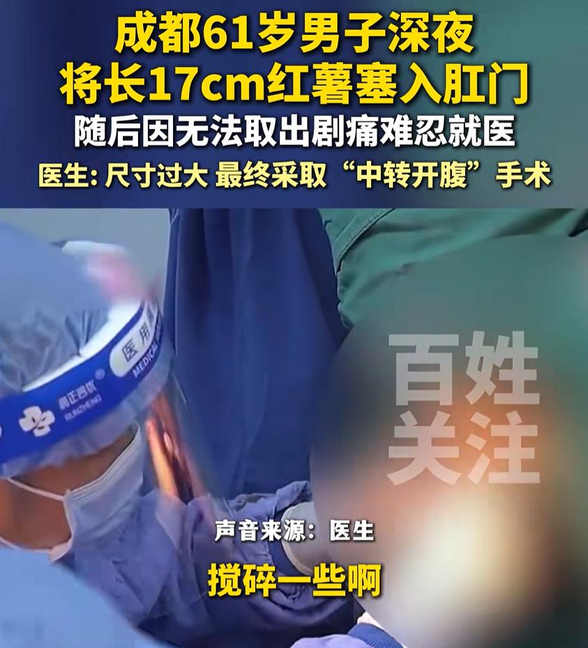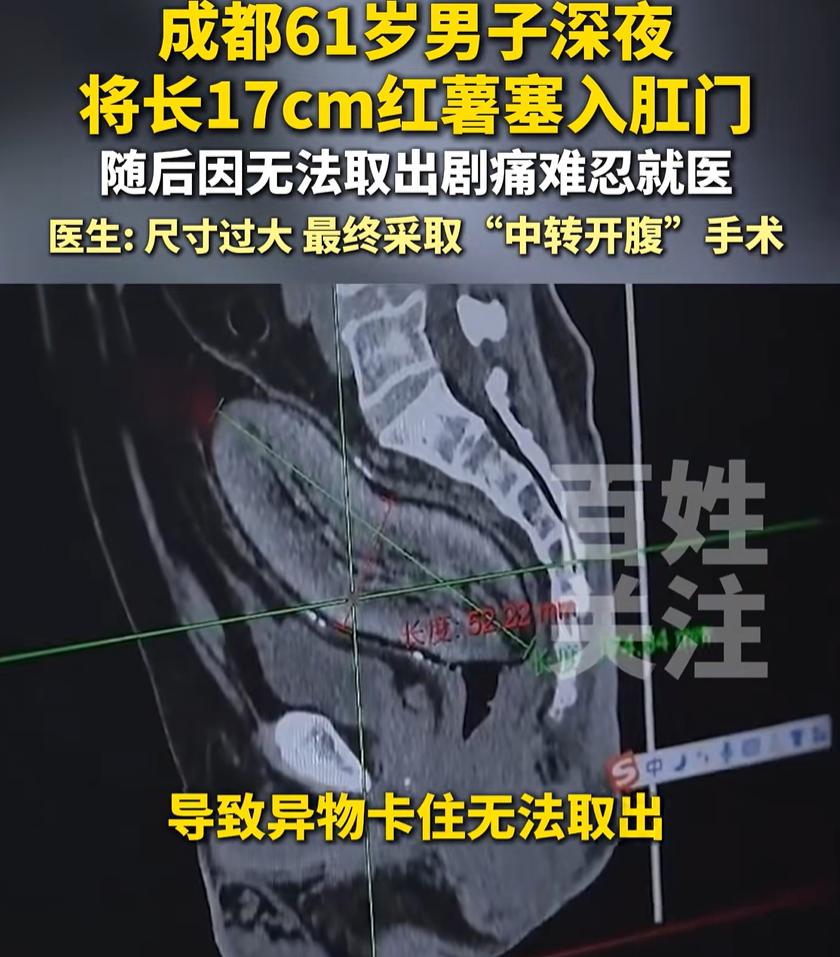 新的一年最狠的男人出现了!四川成都,一男子深夜无聊,竟然找来一根17cm的红薯塞入肛门,不过几个小时后,身体疼痛难忍,只能去医院找医生救助,就连医生都没见过这么夸张的问题,最后只能做手术取出 据医生介绍,该男子今年61岁,半夜十一点,随手拿起家里一根红薯。这根红薯长约十七厘米,粗细跟普通水杯差不多。他没多想,就把红薯往自己肛门里塞了进去 到了凌晨四点,男子被一阵剧烈的疼痛惊醒。他试图自己把红薯弄出来,但已经完全卡住,动弹不得。疼痛越来越难以忍受,他只好匆匆赶往医院求助 值班医生见到这个情况也吃了一惊。这么大体型的东西卡在身体里,确实不多见。医生先尝试将红薯搅碎,但红薯质地坚实,这个方法行不通。接着医生又找来红酒开瓶器,试图固定住红薯把它拽出来,可还是失败了 折腾了好一阵,红薯依然牢牢卡在体内。医生和患者沟通后,决定进行中转开腹手术,也就是通过腹部切口来取出异物。最终,这根惹事的红薯被成功取出,患者也脱离了危险 不得不说,要不是看到媒体报道,就连想我都不敢想这种剧情,而不少网友看到后也是纷纷调侃起来 有网友说:可以去蒸个桑拿,等红芍熟了软了就出来了 当然,玩笑归玩笑,我们更该看到背后的现实。一是对身体结构和风险的无知,觉得只要不见血就没事。二是独处状态下,缺少约束和判断力,很容易一步走偏。三是羞耻感作祟,让人不敢第一时间求助,反而加重后果 这件事也给我们提了个醒:无论出于什么原因,把非医用物品塞入体内都是极其危险的行为。如果真不小心发生了,不要因为羞耻而拖延就医。医院医生见多识广,不会对你评头论足,他们的首要任务是帮你解除危险。越早就医,处理起来越简单,拖得越久,问题越麻烦