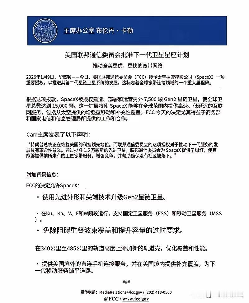 就在公示了中国最新申请的20万颗卫星之后,1.9号当天美国也批准了下一代星座计划,现有已部署8000颗基础上增加了7500颗。 这记来自美国的回应,快得像是预设好的剧本。美国联邦通信委员会(FCC)在1月9日批准了SpaceX的申请,允许其在现有基础上增加部署7500颗第二代“星链”卫星,使其获批的二代卫星总数达到15000颗。审批理由冠冕堂皇:为了“加强竞争”、“连接服务不足的社区”。 然而,这种你追我赶的态势,远非商业竞争那么简单。它是一场围绕低地球轨道(距离地表约340至500公里)的 “圈地运动” ,争夺的是未来数字时代至高无上的战略资源——轨道和频率。这里通信延迟最低,军事价值最高,资源却最为稀缺。 国际电信联盟的规则很残酷:“先登先占” 。这意味着,谁先申报并成功发射卫星,谁就锁定了资源使用权。逾期未完成部署,资源将被回收。这是一场没有退路的赛跑。 中国的20万颗卫星申请,正是对这一残酷规则的直接回应。这次申请主体非常特殊——无线电创新院,这是一个由国家无线电监测中心、中国星网集团、中国电科等七家“国家队”单位联合共建的新型研发机构。它甫一成立,就申请了包含两个近10万颗卫星的巨型星座。这清晰地表明,中国的卫星互联网资源布局已从企业层面,彻底上升至国家战略层面。 数字对比揭示了竞争的烈度。全球已申报的低轨卫星总数早已超过10万颗,而理论容纳上限仅约6万颗。SpaceX一家就申报了4.2万颗,中国在本次大规模申请前,已成功申请的资源约5.13万颗。轨道早已“一位难求”。 更严峻的差距在现实部署。SpaceX目前已累计发射超1万颗卫星,在轨稳定运行的超过8600颗。相比之下,截至当前,中国实际在轨的低轨通信卫星仅约300余颗。申请是蓝图,发射才是实绩。我们手握庞大的“资源存折”,但急需将其转化为太空中实实在在的“资产”。 这场竞赛的本质是什么?低轨卫星网络是未来6G通信的基石,是无人驾驶、全球物联网等未来产业的必备基础设施。从军事角度看,它更是构建全域通信、侦察、导航乃至对抗能力的关键。这已不仅是商业前景的争夺,更是国家综合安全和未来竞争力的终极博弈。 我们最大的优势,是统一意志下的超大规模市场与完整工业体系。无线电创新院这类“国家队”的入场,旨在整合全国研发与产业资源,挑战SpaceX的领先地位。我们的商业火箭公司,如蓝箭航天、星河动力等,也在可回收技术等领域奋力追赶,力求降低发射成本。 但我们面临的挑战同样巨大。除了发射数量的差距,还有运力瓶颈。我国现役主力火箭的近地轨道运力与SpaceX的猎鹰9号仍有差距。将20万颗卫星的蓝图变为现实,需要我们在未来十多年里,完成近乎“航班化”的密集发射。这考验着整个国家的航天工业产能和技术迭代速度。 这场太空“圈地战”没有温情。每一步都踩在规则与时间的红线上。中国的20万颗卫星申请,是一次极具魄力的战略宣示和资源卡位。而美国紧随其后的批准,则是明确的应战。真正的较量,现在才刚刚开始。未来的星空,将由今天的地面竞赛决定。 各位读者你们怎么看?欢迎在评论区讨论。 中国航天的卫星 中国卫星 中国卫星上天 中国星链 宇宙星链计划 卫星01星