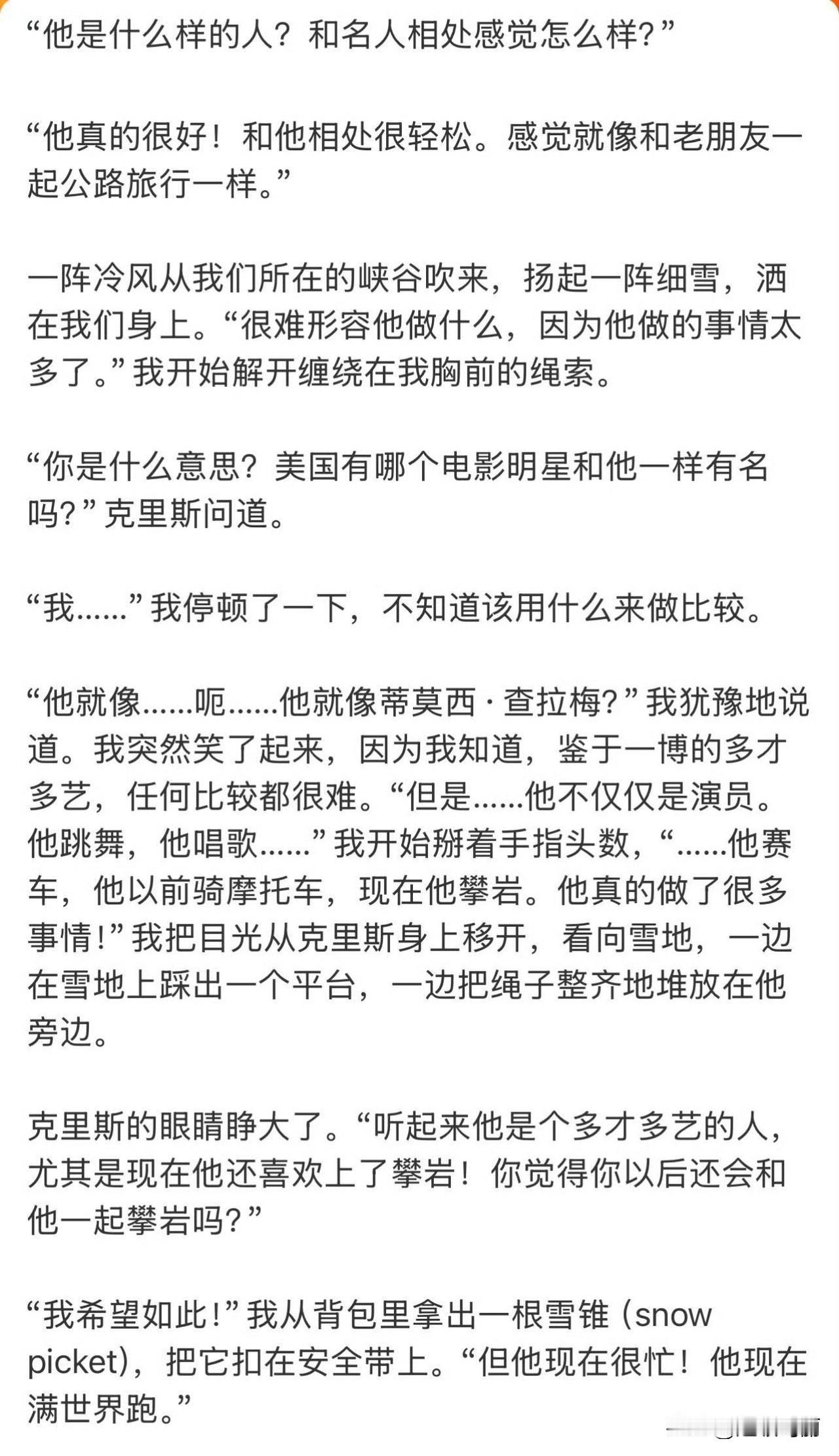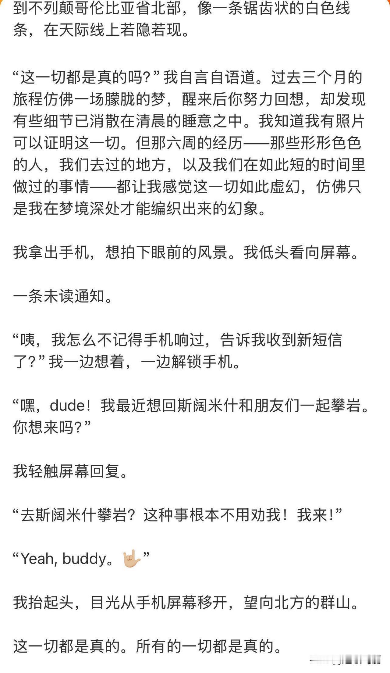 史瑞德写的探索新境2 收官小作文 给我看泪目了: “这一切都是真的吗?”我自言自语道。过去三个月的旅程仿佛一场朦胧的梦。 我抬起头,目光从手机屏幕移开,望向北方的群山。 这一切都是真的。所有的一切都是真的。 他真的很喜欢王一博 这个伙伴了,那种太美好的记忆美得像虚幻的梦、像揉碎的月光织成的梦,生怕稍一用力,它就顺着指缝,悄无声息地溜走了,怕风一吹,连带着那些温柔的碎片,都消散得无影无踪。 但幸好王一博是很好的人,会把美丽的幻境带到现实,告诉你我在🥹