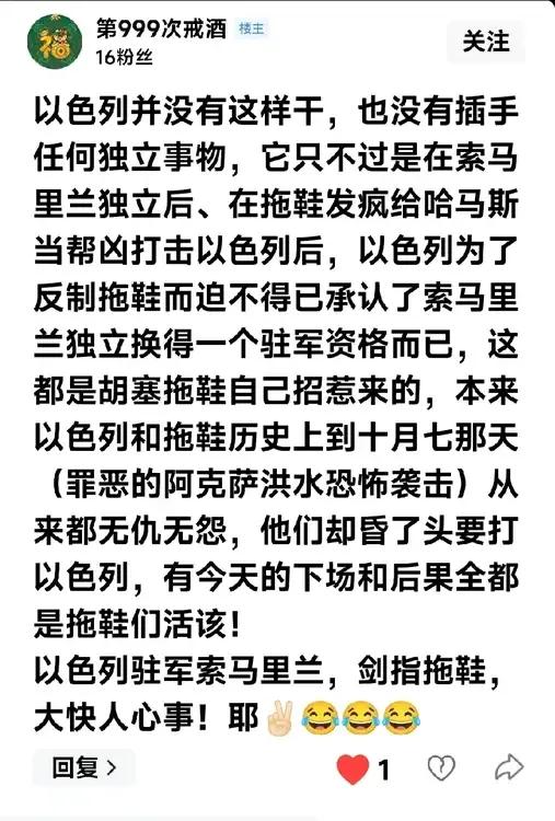 大快人心事——以色列驻军索马里兰,剑指拖鞋军,太棒了![大笑] 下面👇🏻这个网名“第99次戒酒”胡说“以色列分裂他国了”,对此我做了坚决反驳,我对他说—— “我们也积极支持了东帝汶独立,到现在为止还在一直出钱出人出力出兵给他们帮扶,这个事难道你就不知道吗???” “可以色列并没有这样干,也没有插手索马里兰任何独立事务,它只不过是在索马里兰宣布独立后、在拖鞋军发疯给哈马斯当帮凶打击以色列后,以色列为了反制拖鞋而迫不得已承认了索马里兰独立换得一个驻军资格而已,以便打击胡塞,这都是胡塞拖鞋自己招惹来的,本来以色列和拖鞋历史上到十月七那天(罪恶的阿克萨洪水恐怖袭击)从来都无仇无怨,他们却昏了头要打以色列,有今天的下场和后果全都是拖鞋们活该! 以色列驻军索马里兰,剑指拖鞋,大快人心事!耶✌🏻😂😂😂” 我个人认为拖鞋真是活该—— 这下子知道以色列不好惹了吧?以色列要么不出手,出手就直接卡在它的七寸上,这一招太高明了,实在是高!👍🏻👍🏻👍🏻[呲牙]