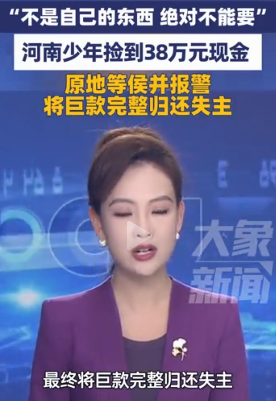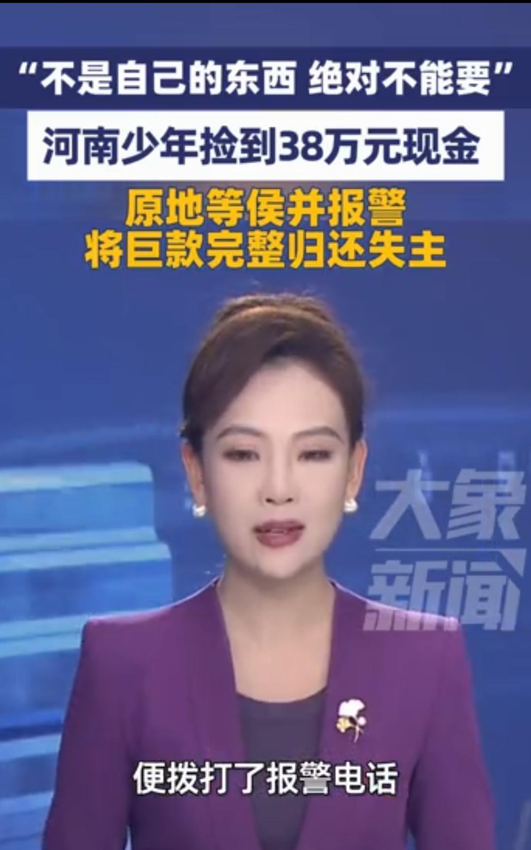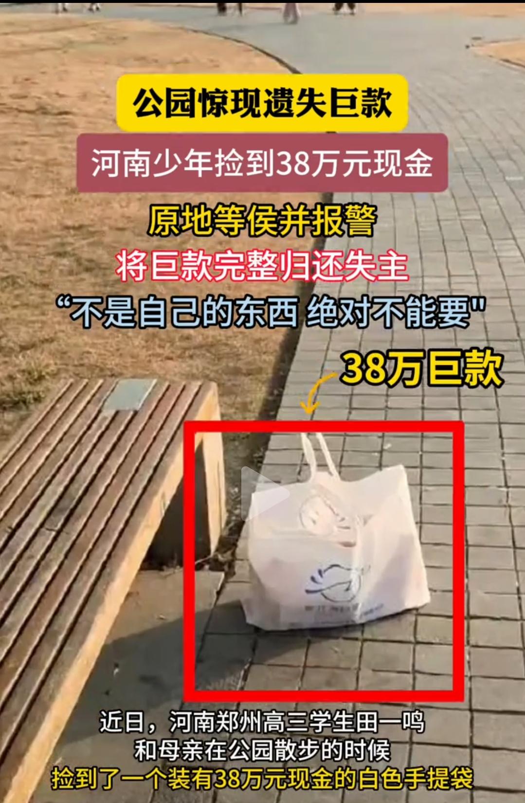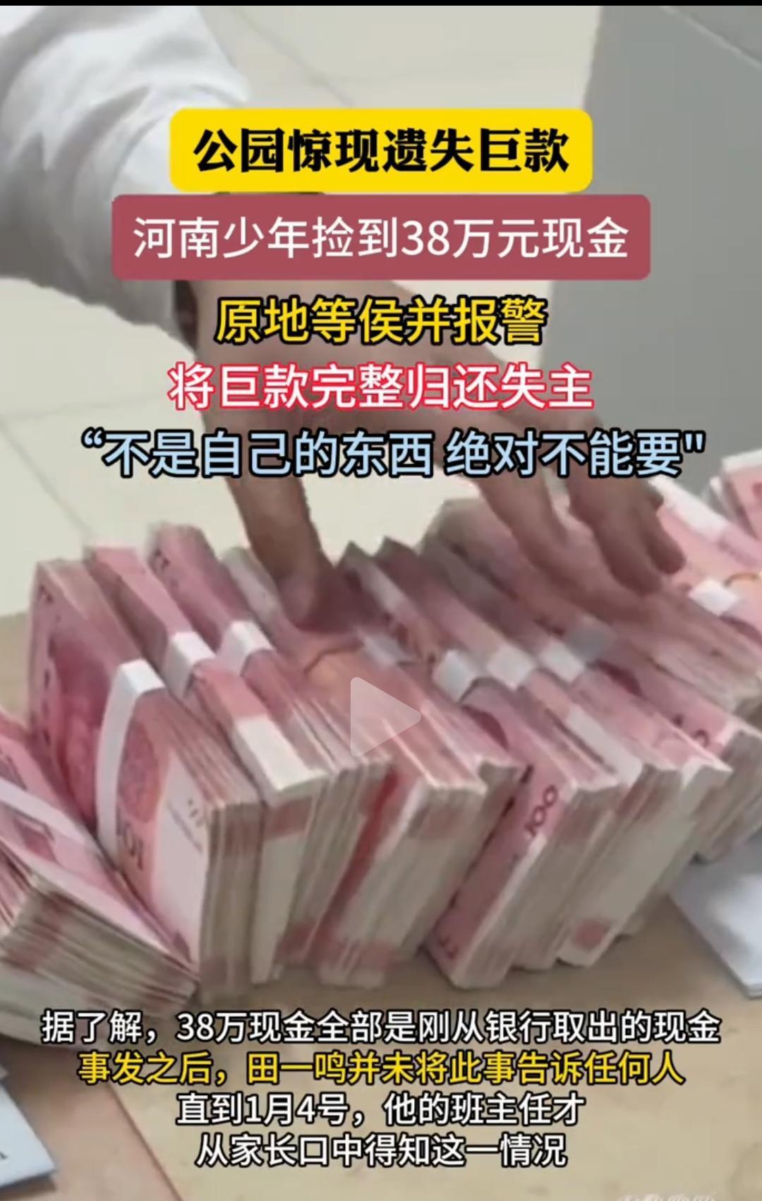 公园惊现38万元巨款!郑州少年原地守候并报警,警察:失主已找到,为少年点赞 “不是自己的钱,一分都不能拿!”2025年12月29日下午,郑州航空港区康平湖公园内,高三学生田一鸣用一句朴实的话、一个坚定的行动,完成了一场38万元巨款的诚信考验。面对遗落的钱财,这位18岁少年坚守本心、原地守护、主动报警,最终让巨款完璧归赵,用青春正能量温暖了整座城市。 在这个物欲横流、诱惑众多的时代,年轻人能如此坚守诚信,实属难能可贵。郑州航空港区康平湖公园的这场“38万元大考”,不仅是一场关于金钱的考验,更是一场关于人性与道德的深刻洗礼。 那天下午,18岁的高三学生田一鸣在公园散步,无意中发现地上赫然摊开着厚厚一沓现金——整整38万元!面对这样巨额的钱财,普通人或许会心生犹豫:“这是天降横财?留着自己用不是更好吗?”但田一鸣的答案却坚定且简单:“不是自己的钱,一分都不能拿!” 他没有被金钱的诱惑迷惑,也没有选择隐瞒或私自处理,而是立即留在原地等待失主出现。时间一分一秒地过去,四周人来人往,没人声称这笔失物的归属。田一鸣毫不动摇,毅然打通了报警电话,将这笔巨款完整交给了警方。整个过程,他眼神沉着,步履坚定,宛如一面不染尘埃的诚信旗帜。 这件事迅速在郑州乃至全国传开,网友们纷纷点赞:“青春就是应该这样有担当!”“诚信,是最美的底色!”更有不少家长感叹:这样的年轻人,是社会的希望,是未来的栋梁。 反观现实生活中,类似的“巨款丢失”事件时有发生,但能“坚守初心”,“不拿一分钱”,并且主动报警的却凤毛麟角。田一鸣用行动告诉我们,金钱的价值远不及品德的光辉。他用“守护”二字,为青春刻下了最亮眼的一笔。 不仅如此,这件小事背后,还蕴藏着更深刻的社会意义。在诚信缺失屡见不鲜的今天,信任成为最为珍贵的社会“货币”。田一鸣的举动,恰如一面镜子,让人们反思:我们每个人是否也能在诱惑面前坚守底线?在复杂的社会关系中,是否还能保持一份纯净与坚定? 或许,正是因为有了像田一鸣这样一代又一代“诚信传人”,这个城市才不会被冷漠和利益蒙蔽。正能量的传播,就像冬日里的阳光,温暖而明亮,照亮了每一个角落,也照亮了无数人的心房。 这场关于诚信的考验,以最纯粹的正义结局,诠释了当代青年的责任与担当,也让我们看到:守住诚信的灵魂,远比拥有任何财富更为珍贵。愿田一鸣的故事,成为鼓舞更多人的力量,让这份正能量在每个人心中生根发芽,开出幸福与希望的花朵。河南郑州一中学生公园捡到38万现金 少年公园捡到38万巨款 原地守候报警