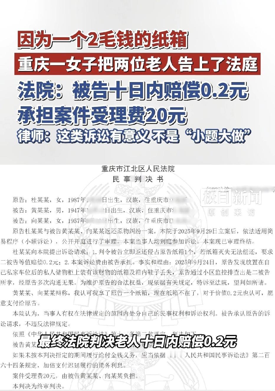 重庆,一女子在自家私家车位的储物柜上,放了个装鞋的纸箱,结果却被人拿走了,女子多次找对方讨要,对方却拒绝归还,女子一气之下将人起诉了,并要求对方要么归还纸箱,要么赔偿0.2元,最终,法院判了。 杜女士家私家车位的储物柜上,放了个装鞋子的纸箱,看着不起眼吧? 结果2025年9月24日一瞅,没了! 自家专属区域的东西凭空消失,换谁心里都得犯嘀咕,这可不是“捡个破烂”那么简单,私人财产再小也不能说没就没啊。 调了小区监控一查,是69岁的向大爷和79岁的黄大爷拿的。杜女士找两位老人沟通,想着把东西要回来就行,毕竟也不是多贵重的物件,可没想到沟通了好几次都没结果。 这就有点说不过去了,捡到别人东西还拒不归还,再不值钱也是别人的合法财产,哪能凭自己意愿占着不放? 没法子,杜女士只能起诉到法院,诉求很简单:要么还纸箱,要么赔0.2元,诉讼费得由对方承担。 估计有人觉得这是“没事找事”,2毛钱犯得着闹到法院吗?但换个角度想,这从来不是钱的事,是争个理儿啊! 庭审时,两位老人也没否认,承认拿了纸箱但说已经不在了,也愿意赔2毛钱。 最终法院判了:老人十日内赔0.2元,还要承担20元案件受理费。 你看,捡个2毛钱的纸箱,最后倒贴20元,这亏吃得不冤,也算是个教训。 律师都说了,这官司很有意义,根本不是小题大做。法律面前无小事,哪怕是几分钱的东西,只要是合法财产就受保护。 这起案子其实是在提醒大家:别觉得东西不值钱就随便拿,侵占他人财物早晚要担责;也别因为权益小就忍气吞声,该维权时就得拿起法律武器。 尊重别人的财产,就是尊重自己,这才是最实在的道理。