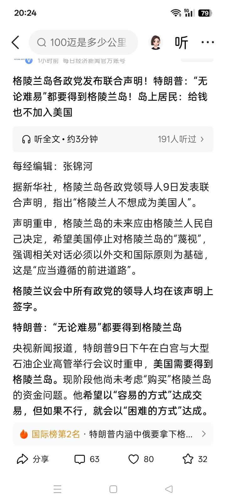 当头一棒? 格陵兰岛所有的政党联合发表声明,表示:格陵兰岛人不愿意成为美国人。并且强调,格陵兰岛的事情应该由格陵兰岛人来主导,而不是被别的什么人随意主导。 当某些人似乎完全自以为是,想当然的给格陵兰岛定位的时候,大概万万没想到,却就像被格陵兰岛人迎面送来了一棍子。 钱不是万能的,就连军事力量在很多时候也不一定就是万能的。 其实,现在的国际社会,正是深刻认识武力的严格局限性。