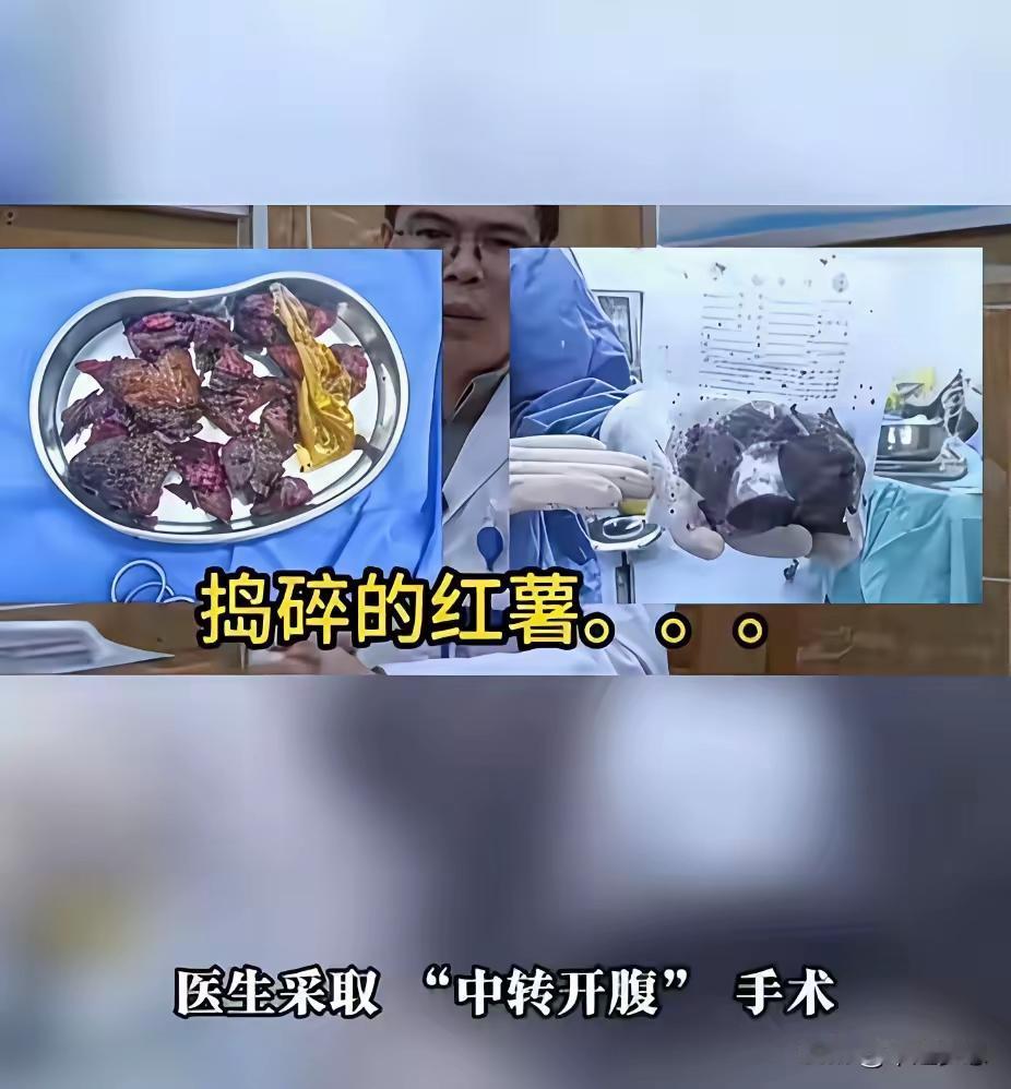 这合适吗? 成都一位大爷,今年61岁,谁知道却有着那么重的好奇心。在夜里11点的时候,不知道从哪里学的,整来一根长约17厘米的红薯,塞进了自己的肛门。 没想到身体出状况了,4点多钟疼痛难忍,只能到医院赶紧急诊。医生一看也犯了难,因为这红薯长17厘米,直径达到了6、7厘米,就想着用红酒开瓶器,把红薯给拧出来,结果失败了! 后来,医生采用了中转开腹的手术方法,成功将红薯捣碎了,大爷这才解除了疼痛,保住了性命。 估计大爷以后再也没这么重的好奇心了,最后终究是红薯承担了所有 ,粉身碎骨了!