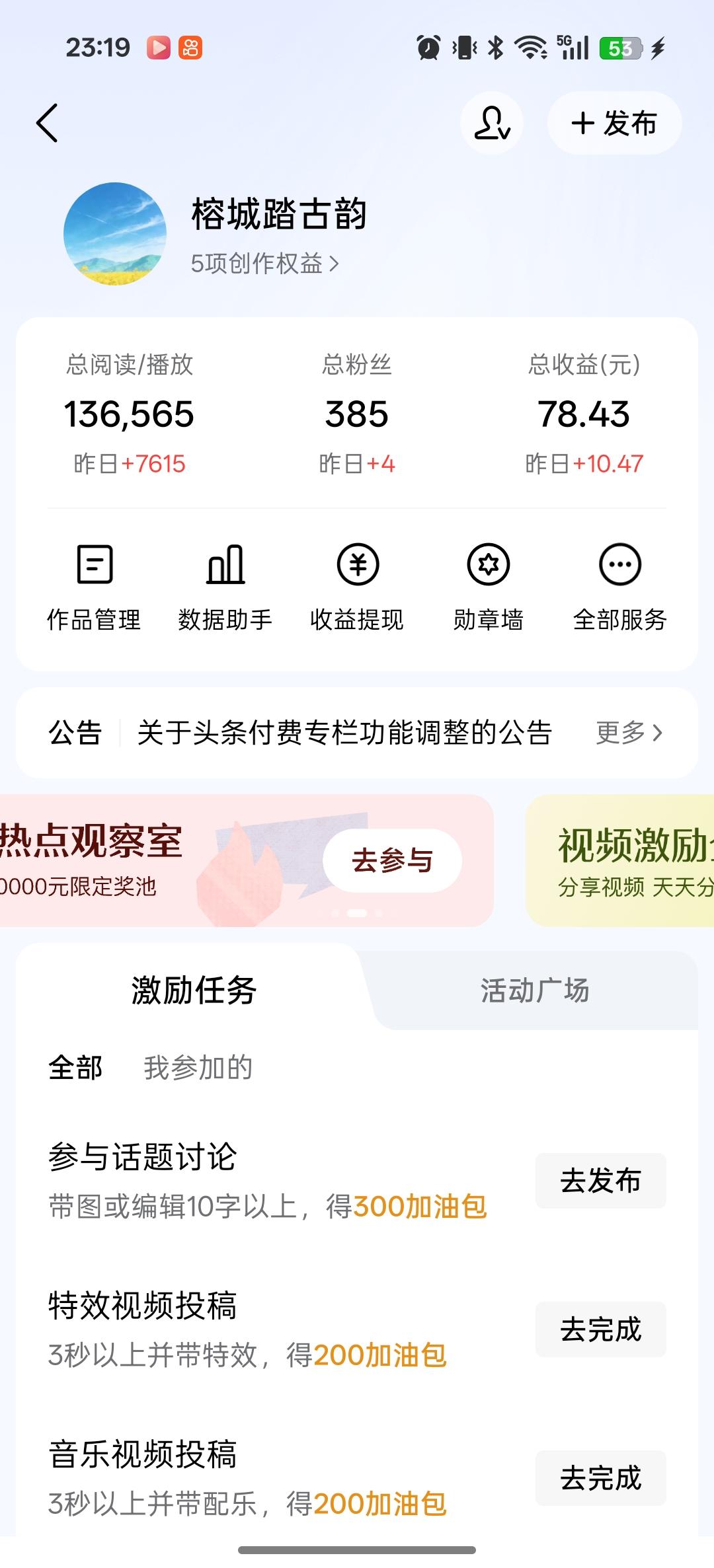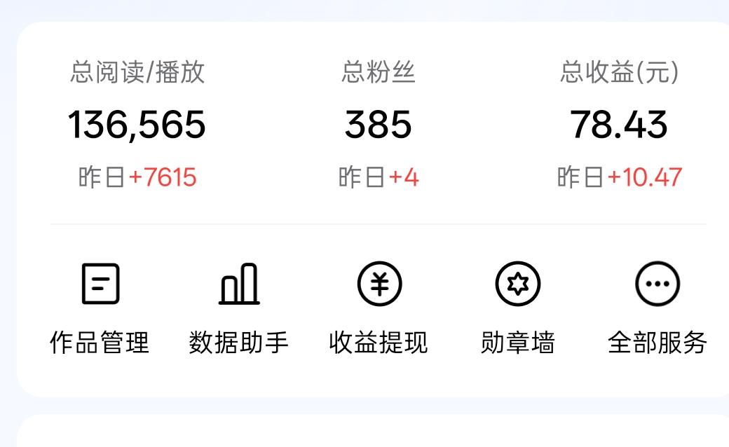 这是我做微头条半个月的数据,有点收益也知足了,慢慢来,毕竟刚刚上手,佛系一点,太急于求成,反而把自己搞焦虑了,也不好。任何事情都有个学习的过程,我相信,只要用心,只要肯花功夫,收益一定会在不久的将来上升一个台阶的。 同时也希望像我一样的新手,多给自己鼓劲,流量上不来,不要着急,多找原因,多学习,多给自己正能量,把根基打牢,总有一天,你会脱引而出的,请相信我! 我们大家一起努力,加油加油!![加油][加油][加油]
