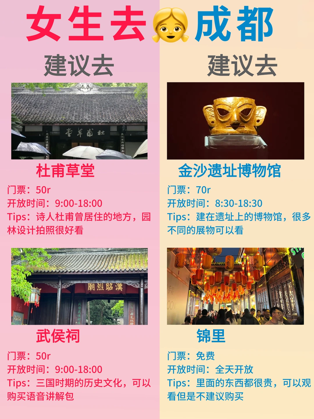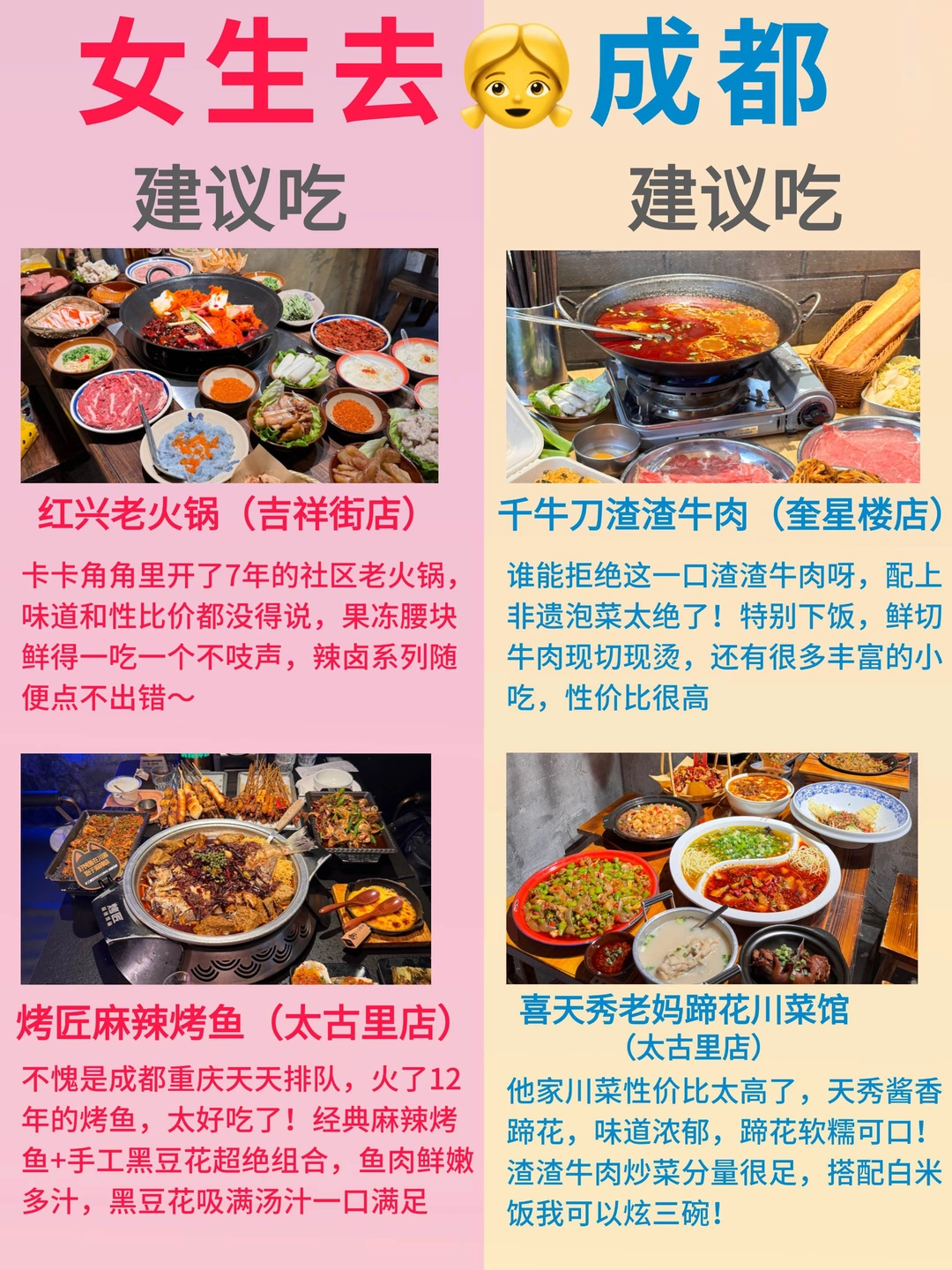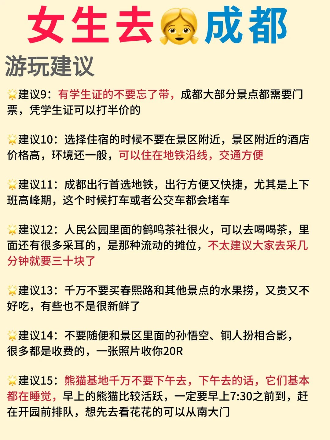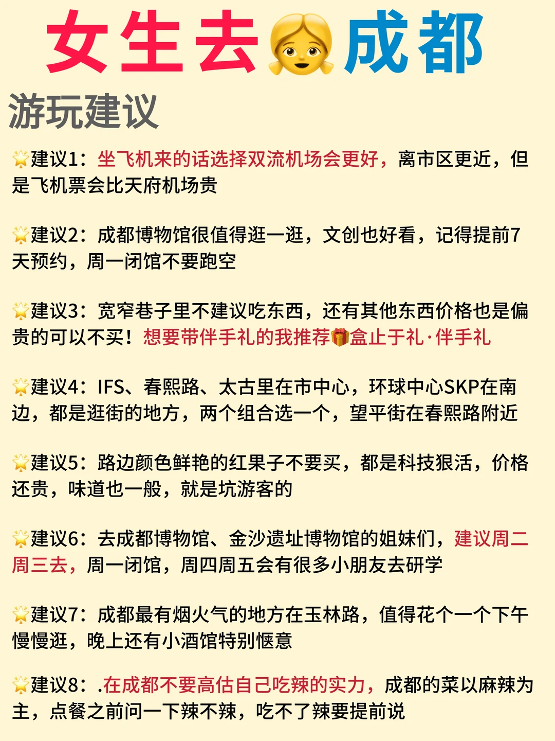 现在来成都耍正是好时候,吃喝玩乐样样俱全,主打一个开心旅游✌️ - 来成都要注意的tips ✈️坐飞机选择双流机场 🚇出行首选地铁,交通便利不堵车 💕吃不了辣,吃不惯折耳根的宝子要提前跟老板说 🚶♀️景点主动打招呼的不要理,特别是递东西过来的,不要接 👂不要在路边采耳,不卫生也没有保障 🎁别忘了带一份熊猫礼盒伴手礼:- ✅土著认证的成都美食 💕红兴老火锅(吉祥街店) 💕烤匠麻辣烤鱼(太古里店) 💕千牛刀渣渣牛肉(奎星楼店) 💕喜天秀老妈蹄花川菜馆(太古里店)