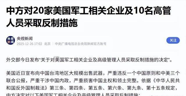 针对中方制裁!美国表态!美国国务院新闻负责人表示,针对美国政府批准对台出售武器一事,中国对美方涉事军事相关企业等实施制裁的举动,美方表示强烈反对。美国反对无效。中国怎样处理台湾事宜,是中国家里的事,轮不着你这个八竿子打不着的外人说三道四。 美国刚批准向台湾地区出售超过111亿美元武器,这是历史上单笔金额最大的一次,包括海马斯火箭系统、陆军战术导弹、自走火炮、反坦克导弹和鱼叉导弹维护部件等。台湾地区防务部门很快就表示感谢,说这能提升自卫能力。 没过几天,12月26日,中国外交部直接公布反制决定,依据反外国制裁法,对20家美国军工企业加上10名高管动手。名单里有诺斯罗普·格鲁曼、波音圣路易斯分公司、L3哈里斯这些老牌巨头,还有安杜里尔这样的新兴公司,高管包括安杜里尔创始人帕尔默·卢基。措施很具体:冻结他们在华资产,禁止境内交易合作,高管不准入境,连港澳都不行。 这动作来得快,从美方宣布军售到中方反制就九天时间,针对性强,覆盖整个产业链,从重型装备到无人机和人工智能。很多人说,这次力度大,名单精准,不像以前那么象征性。 美国国务院很快就跳出来,说强烈反对,声称他们的军售符合历届政府政策,有助于地区平衡,还要求中方别对台湾地区施压。说白了,就是老一套,坚持售武是常态,还把责任往中方身上推。 说到底,台湾地区事务是中国内政,一个中国原则是国际共识,美方明知故犯,持续输出武器,触碰红线。中方反制是正常回应,合情合理合法。美方反对也没用,挑衅就有代价。 这些美国企业大多在华业务本来就少,制裁直接影响有限,但信号很清楚:参与售武就得承担后果。全球供应链一环扣一环,丢了中国市场和资源,有些企业日子不会好过。高管被禁入境,个人层面也受限。 中方多次强调,任何外部干涉都会坚决回击,维护主权决心不动摇。国际社会看得很清楚,一个中国原则是底线,谁越线谁付出代价。这事强化了共识,美方售武改变不了大局,地区稳定靠尊重事实,不是靠武器堆积。 这次事件让很多人看到,剧本真反转了,以前美方制裁别人,现在轮到自己企业被列入清单,还得公开抗议。攻守形势变了,干涉内政没好下场。台湾问题是核心利益,中方捍卫到底,谁也别想低估这份意志。