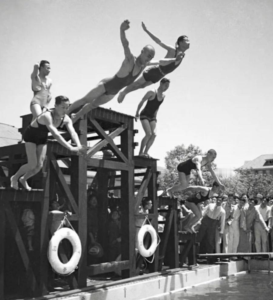 1933年,同济大学学生跳水活动,木质跳台旁热闹非凡,多位学生身着泳衣,有的在跳台边缘准备起跳,有的正腾空展开跳水动作,跳台还挂着救生圈做安全防护;一旁围站着不少师生围观。 1933年的同济大学已是国内兼具工科实力与多元教育的高校,当时西式体育项目正逐步融入校园生活,跳水这类兼具技巧与观赏性的项目,常是校园体育活动的内容之一。