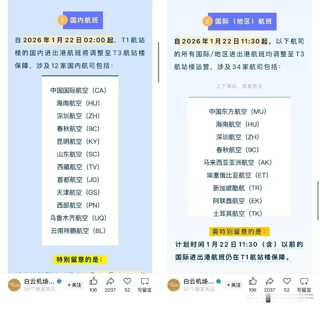 1月21、22两天,白云机场航司将将进行大迁徙,T1的12家国内航司+34家国际航司集体搬到投入运营不久的T3,是检验T3成色的时候了! 虽然没有明确T1改造完工时间,但是毕竟不是小修小补,需要要经过招标、施工等程序,花费几年也是有可能的。 T1航站楼的暂停改造,是为了唤新归来,完工后力争向香港国际机场、新加坡樟宜机场看齐,又将成为广州新地标建筑,也将继续巩固广州枢纽机场的核心地位。 在此期间,T2航站楼基本上不受影响。没有地铁直达,只有城际和大巴接驳的T3能不能经受住客流剧增考验呢? 届时前往白云机场T3搭乘飞机的宝子们真的要预留充足时间,以免耽误行程。 冬日生活打卡季