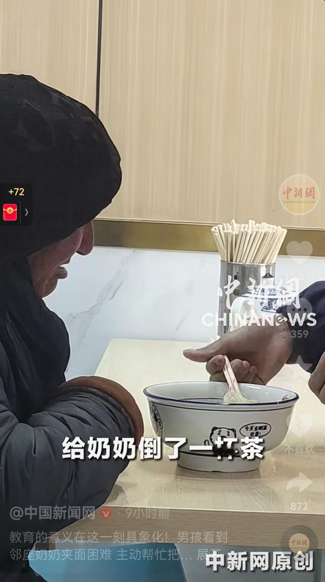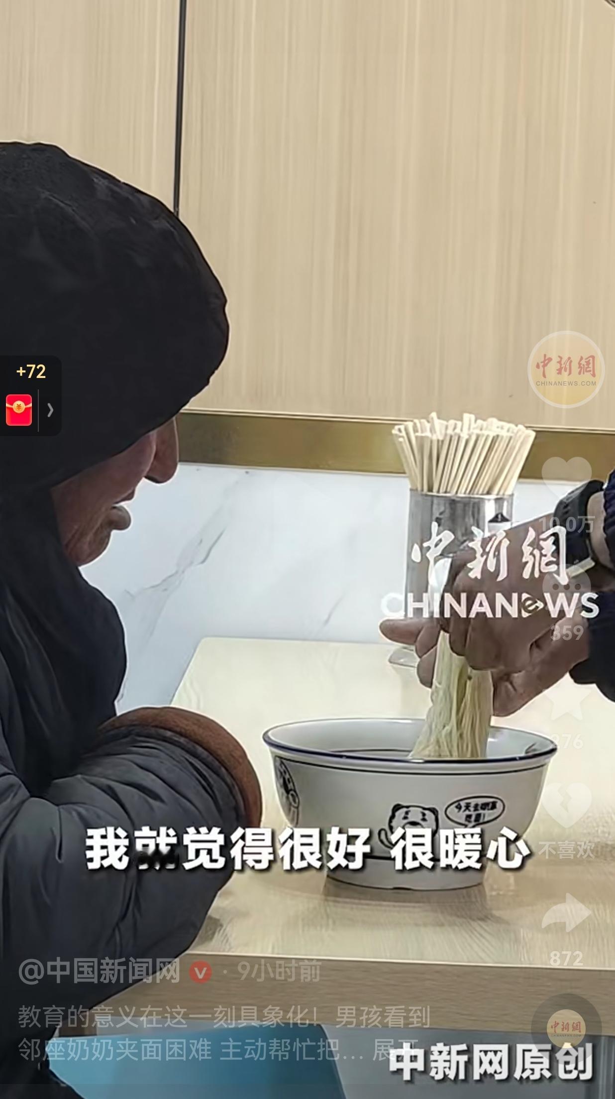 教育的意义在这一刻具象化了!1月9日,甘肃临夏,一家面馆里, 一位老奶奶端着服务员刚刚上来的面条,正在费力吃面条。 这一幕,被邻桌的一个男孩看在了眼里。男孩没有丝毫犹豫,立马起身走到奶奶身边,轻声说了句“奶奶我帮你夹”,然后就拿起奶奶碗里的筷子,耐心地把碗里的面条一根根夹断。 据拍摄者马女士回忆,奶奶可能是因为年纪大了,手上没有力气,还没有牙齿,面条夹起来很费劲,直接吃又容易卡喉咙,每一次尝试都显得特别吃力。 所以,男孩才会主动给奶奶把面条剪断。 令人感动的是,在男孩把奶奶的夹断面条后,他还细心地单独给奶奶倒了一杯茶,这份周到的体贴,让马女士忍不住感慨“我就觉得很好,很暖心”。 此事被马女士拍了下来,发到了网上,有的网友说:“这孩子家教也太好了吧,一看就是被爱养大的。” 还有的网友说:“这就是教育的意义啊,教育的好坏,不在于考多少分,而是学会怎么善待他人”。 是啊,我们总在讨论教育该教给孩子什么,其实答案很简单,就是这份刻在骨子里的善良、懂得体谅他人的温柔,以及待人接物的细致周到。 这个男孩的举,给我们书记了良好的榜样,他用自己的行动告诉我们,善良从来都不是一种选择,而是一种本能。教育也从来不是只教书本上的知识,更是教孩子成为一个温暖的人。 其实,真正的成长,从来都不是变得多么厉害,而是始终保持对他人的善意和关怀。 最后,希望我们都能像这个男孩一样,在生活里多一份留意,多一份善意,并让这份温暖一直传递下去。