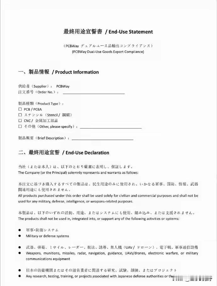 电路板厂商停止向日本发货! 商务部发布对日本出口禁令后,真正的落实了。有日本厂家催促中国厂商发货,得到拒绝的答复。随即,日本厂家写出了非用于军事领域的保证书“最终用途宣誓书”,任然没有得到发货承诺。这说明,我们的厂家正在全民执行国家对日本出口禁令。日本应该是逐步的感觉到疼痛了!
