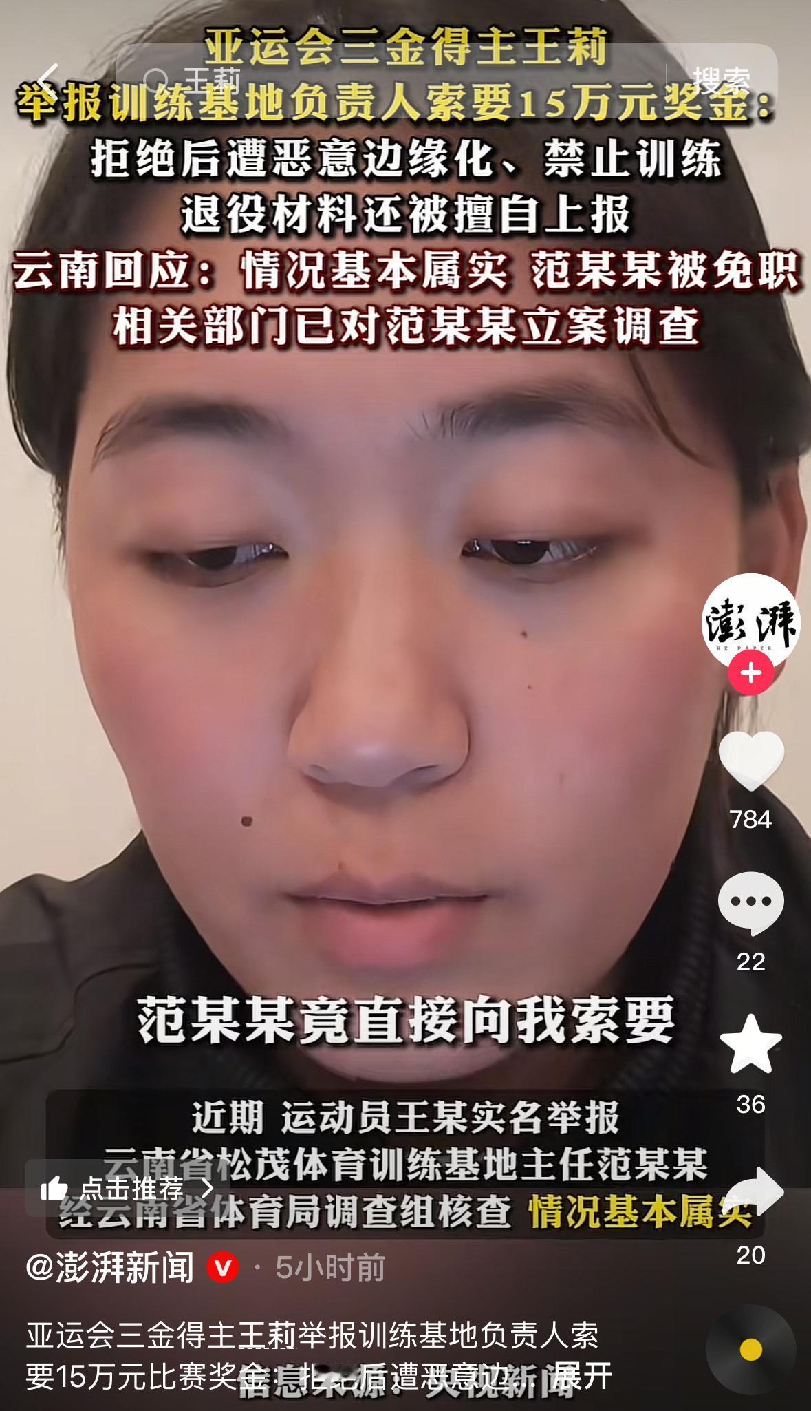 真相大白了!情况基本属实!可恶至极,培养一个冠军太难了,为了个人私利,竟然不顾国家荣誉与利益,直接阻挠亚运冠军训练与参赛。在索要亚运冠军的奖金无果之后甚至直接宣布人家退役,简直是胆大包天。云南省松茂体育训练基地主任范某某这下好日子算到头了。