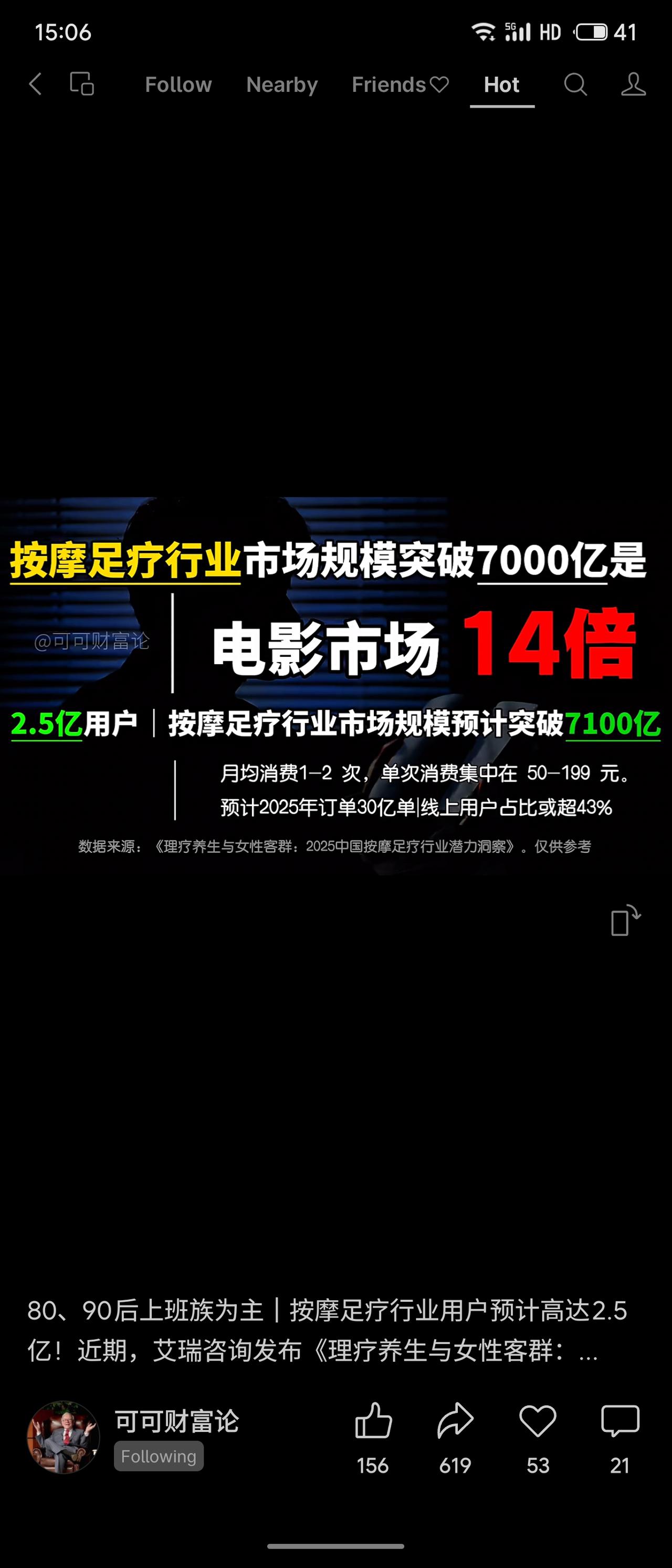 按摩足疗行业市场规模预计突破7100亿元,是电影市场的14倍。用户达2.5亿,以80、90后上班族为主,月均消费1-2次,单次消费50-199元。该数据反映出,随着健康养生意识提升及工作压力增大,以放松、保健为核心的中频次、中等价位的线下服务需求正在迅猛增长。