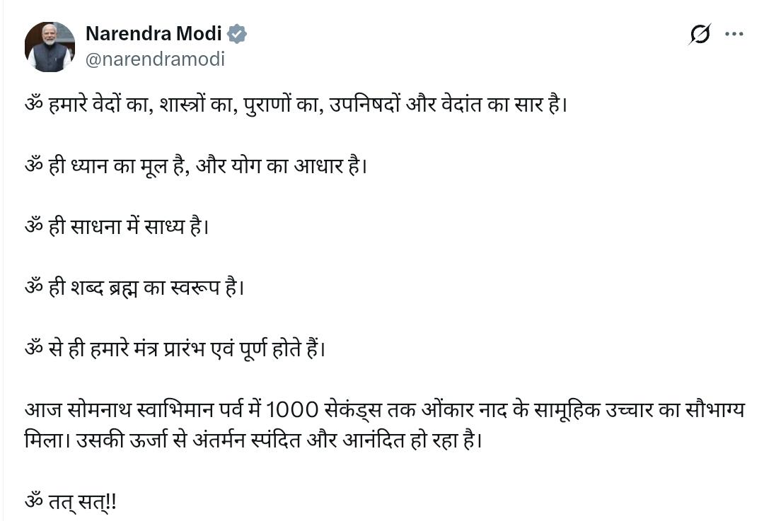 印度总理莫迪:唵是吠陀经、沙斯特拉经、往世书、奥义书和吠檀多哲学的精髓。 唵是冥想的根源,也是瑜伽的基础。 梵音是灵修的唯一目标。 “唵”字本身就是梵天的化身。 我们的咒语以“唵”开头,以“唵”结尾。 今天,在索姆纳特·斯瓦比曼节期间,我有幸与大家一起吟诵了1000秒的唵音。它的能量澎湃而出,给我的内心带来了喜悦。 唵 达 萨特!