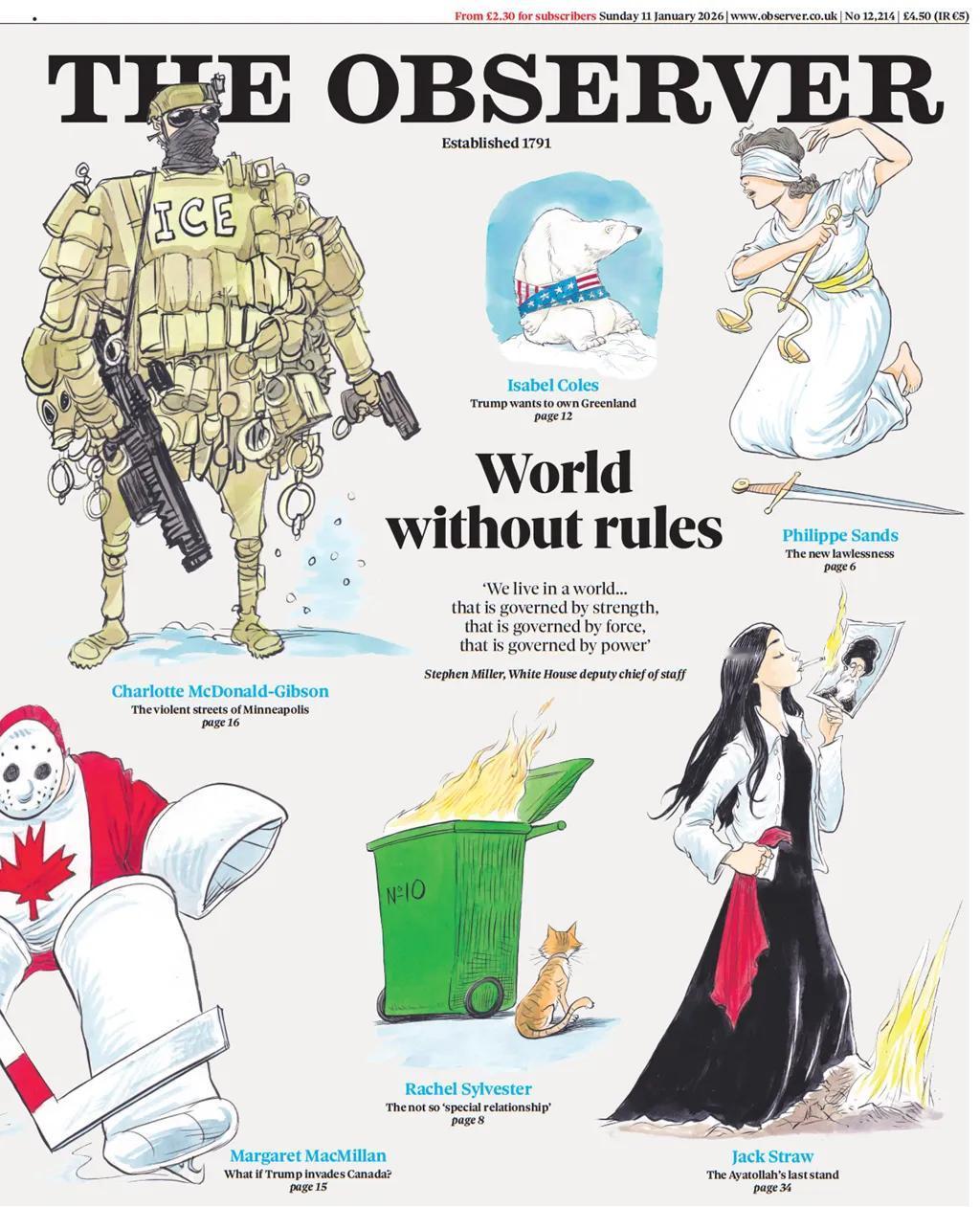 《观察家报》通过多篇文章探讨了所谓的“无规则世界”,探讨了从基于规则的国际秩序转型的概念。 “我们生活在一个……由力量统治的世界。由武力统治的世界,由权力统治的世界。” ---- 斯蒂芬·米勒,白宫幕僚副主任 许多主题围绕唐纳德·特朗普的外交政策展开,包括他对格陵兰和加拿大的野心,而前外交大臣杰克·斯特劳则写到了伊朗领导层面临的危机。