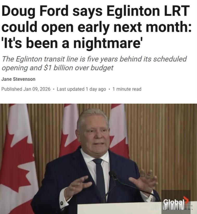 噩梦!加拿大安省一条19公里的轻轨,延误整整5年、预算超支10亿加元! 一再延期、预算严重超支的Eglinton轻轨(Eglinton Crosstown LRT)下月有望通车了。 本周四安省省长福特在怡陶碧谷接受媒体采访时释放了乐观信号。他对记者表示,这条比原定通车时间晚了整整5年、预算超支10亿加元的Eglinton线,有望在2月初开通。 福特说:“我有信心它会在2月初开始运行,我们也会尽一切所能提供支持。” 他还直言不讳地补充道:“谢天谢地,这事儿终于有进展了。这一路简直就是一场噩梦,我率先承认这一点。” Eglinton轻轨全长19公里,沿Eglinton Avenue设有25个车站和停靠点。该项目原计划于2020年完工,但现已成为安省最令人头疼的交通项目之一。 目前,该线路的运营和控制权已从Metrolinx移交至TTC,最终将由TTC决定何时向公众开放。 不过,截至目前,Metrolinx和TTC尚未公布正式的开通日期。